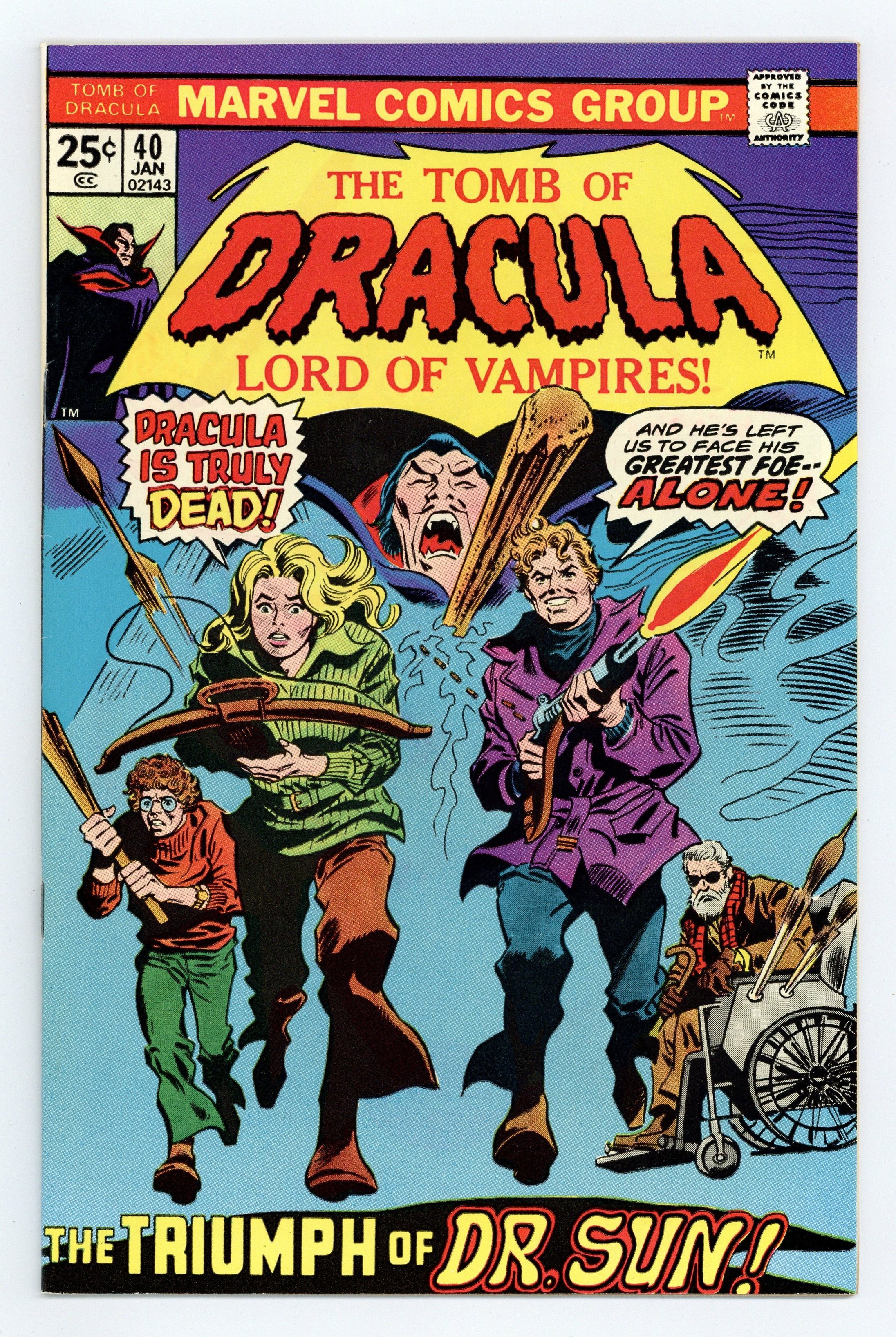 Starts Apr 20 "The Coming of Doctor Sun!" Written by Marv Wolfman. Art by Gene Colan and Tom Palmer. Featuring a helicopter chase down the Transylvanian Alps with Dracula as the un-living target! Plus, the unveiling of the new even more diabolical Doctor Sun! 32 pages, FC. NOTE: 25-cent cover price begins. The letters page contains Marvel Value Stamp series A # 88 (The Leader by Herb Trimpe). Cover price $0.25.