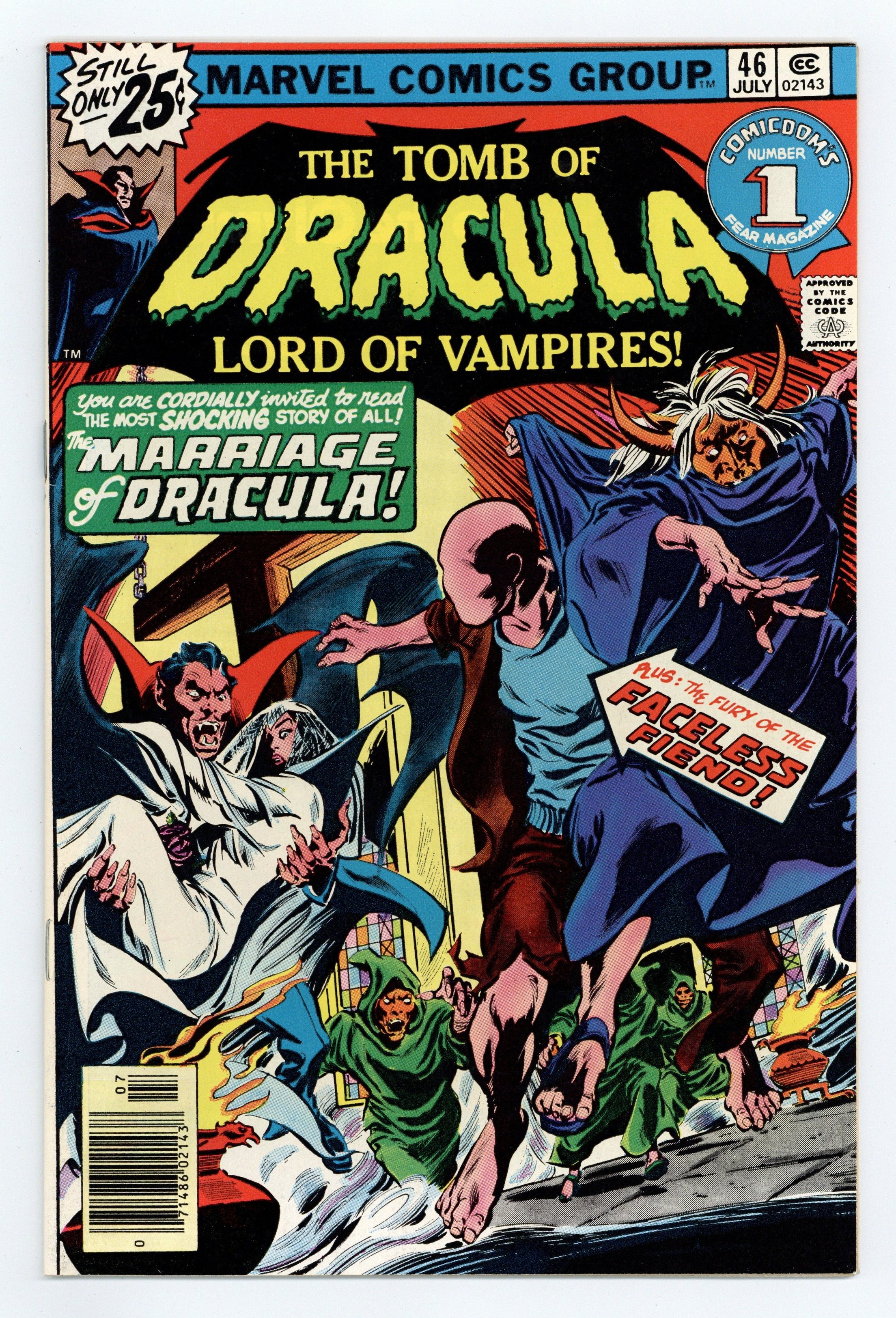 Starts Apr 20 Dracula marries Domini in "Let Us Be Wed in Unholy Matrimony." Script by Marv Wolfman, pencils by Gene Colan, inks by Tom Palmer. Brief Blade appearance. One-page Hostess ad, "Captain America and the Red Skull." Colan/Palmer cover. Cover price $0.25.