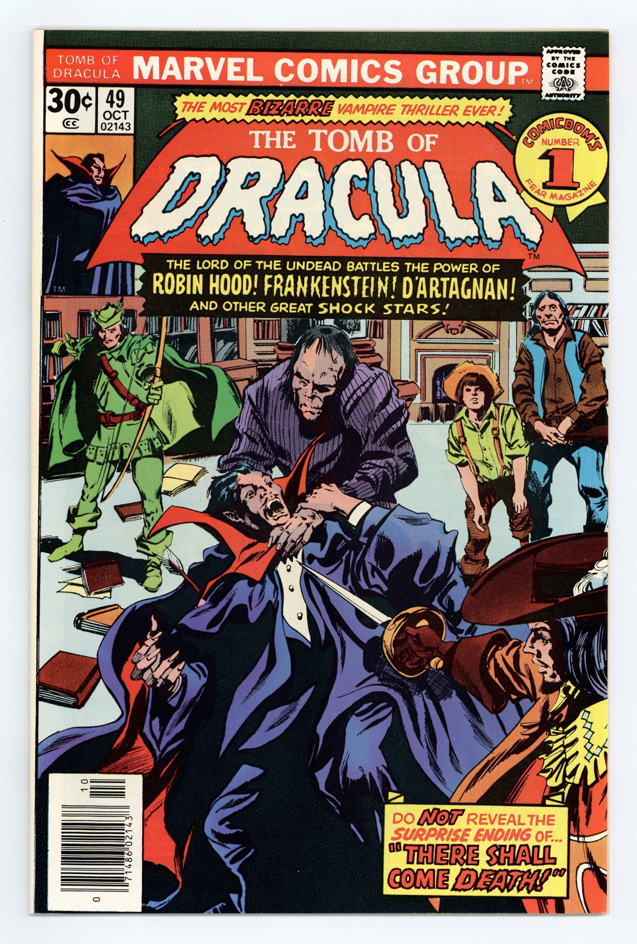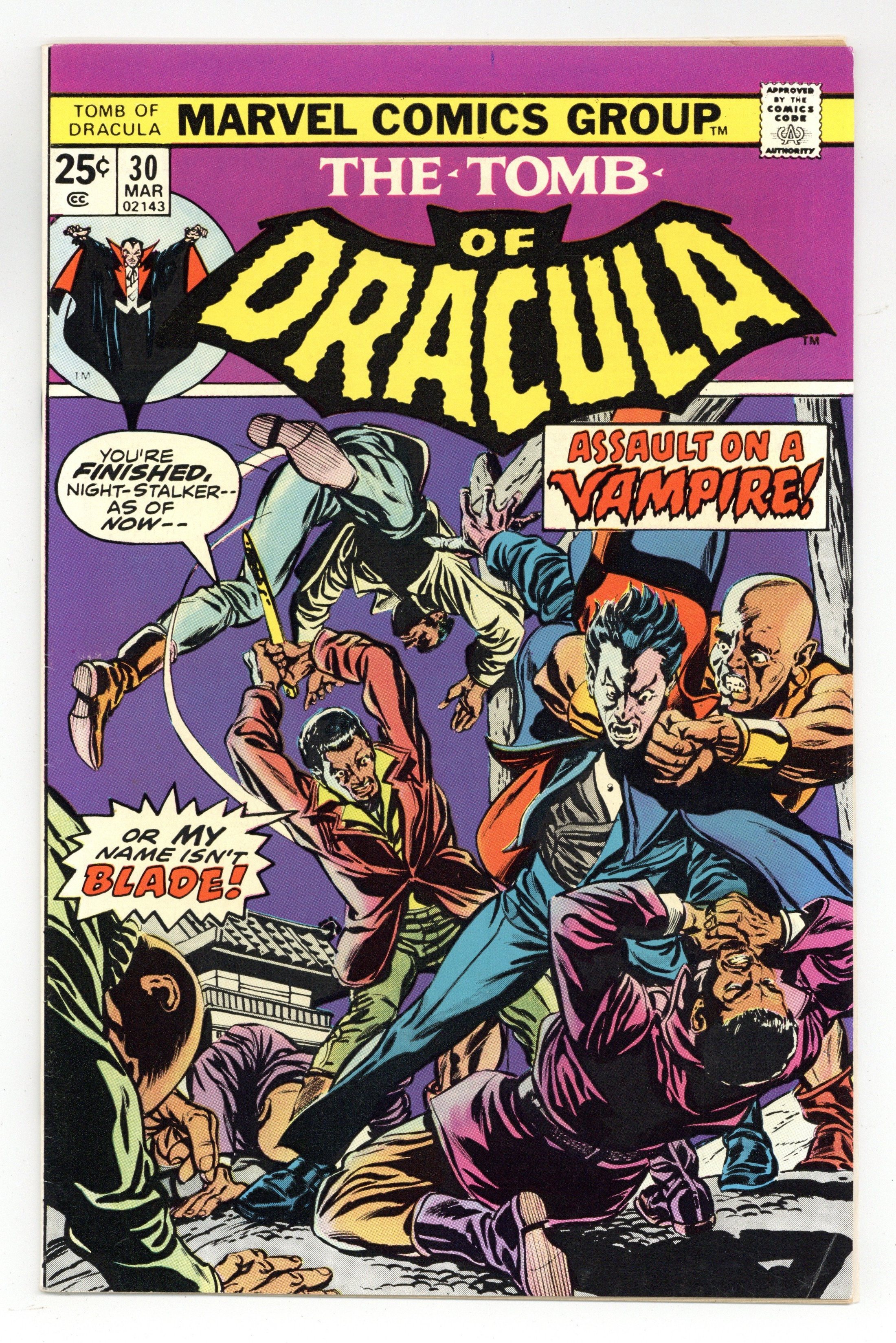 Starts Apr 20 Guest starring Blade, Robin Hood, the Frankenstein monster, D'artagnan, Tom Sawyer, Zorro in "And With the Word There Shall Come Death!" Script by Marv Wolfman, pencils by Gene Colan, inks by Tom Palmer. Colan/Palmer cover. Cover price $0.30.