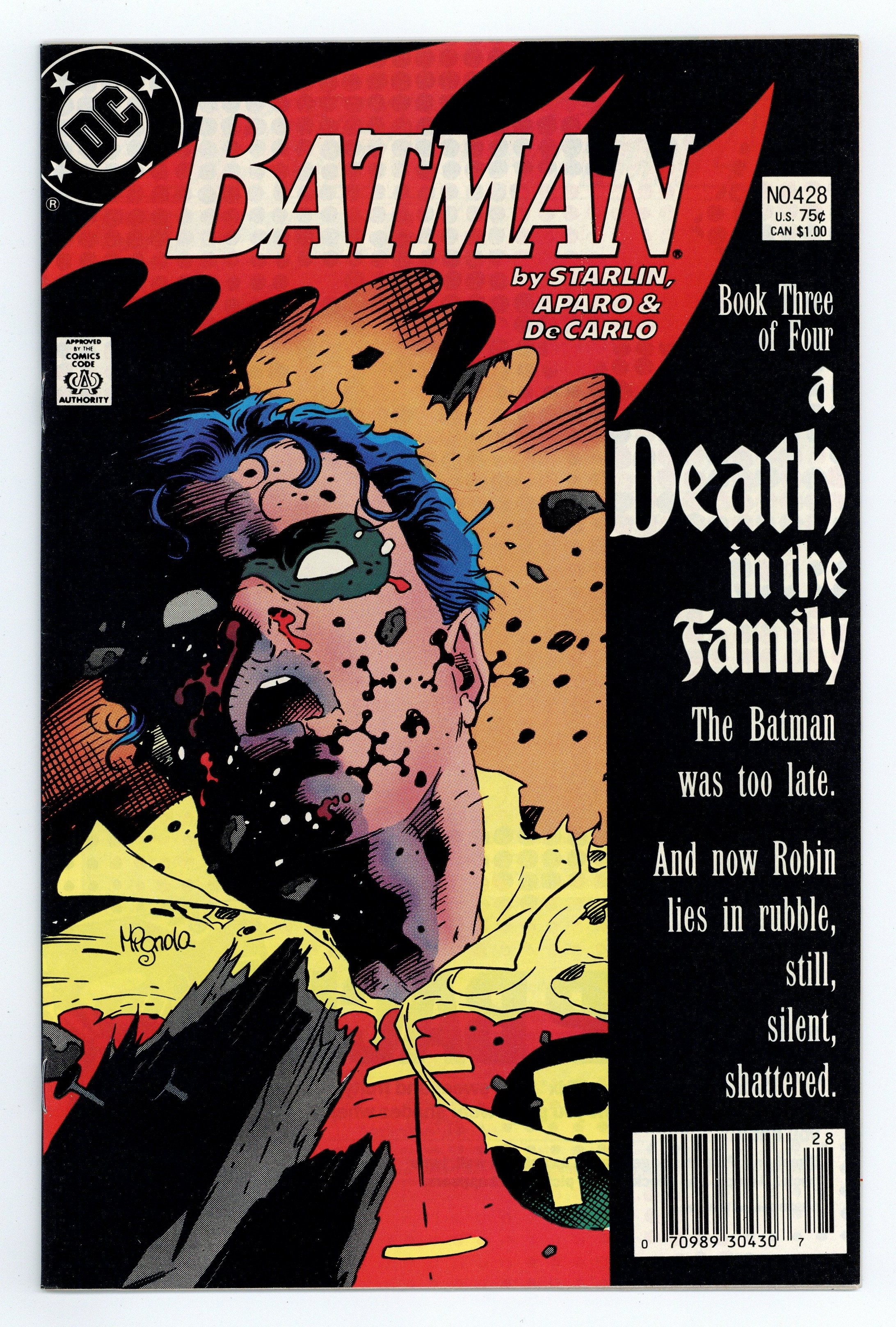 Ends Mar 30 7:32 PM CST Bid History 3 bids Current Bid $9 Your Secret Max Bid If you'd like to bid, please log in or register. First printing. Newsstand Edition. Cover art by Mike Mignola. "A Death in the Family" part 3 of 4, script by Jim Starlin, pencils by Jim Aparo, inks by Mike DeCarlo; Death of Sheila Haywood; Burial of Sheila Haywood and Jason Todd; The Joker becomes the Iranian Ambassador to the U.N. Results of Phone Poll as to whether Robin dies this issue or not. NOTE: Most issues from 397-432 were reprinted in 1989 and sold in multipacks. These 2nd and 3rd prints have back cover ads dated 1989. 36 Pages, Full Color. Cover price $0.75.