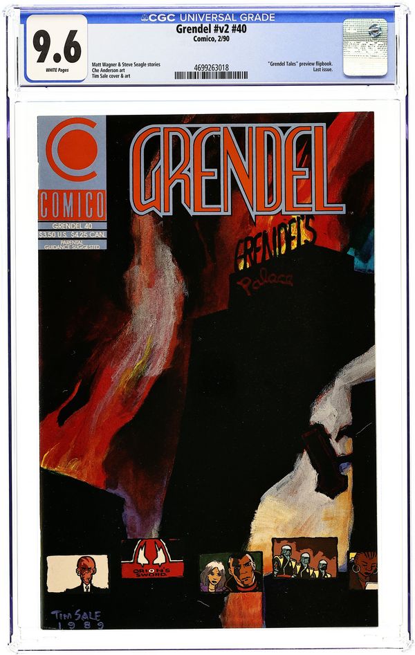 Starts Apr 4 Wrap-around cover by Matt Wagner and Sam Keith. "….Or Not to Be." 22 pages. Part 14 of 15. Story and pencils by Matt Wagner. Inks by Sam Keith. Kevin and Mirth discuss their mutual past and how is shapes their future. Kevin accepts his role and takes the last step to prepare for the final battle. Untitled story. 4 pages. Part 9 of 9. Story and pencils by Matt Wagner. Inks by Rich Rankin. The repercussions of last issues battle resonate with all of those who remain. Will Stacy's sanity be the final casualty of Grendel's criminal reign? 32 pages. Full color. Cover price $1.50.
