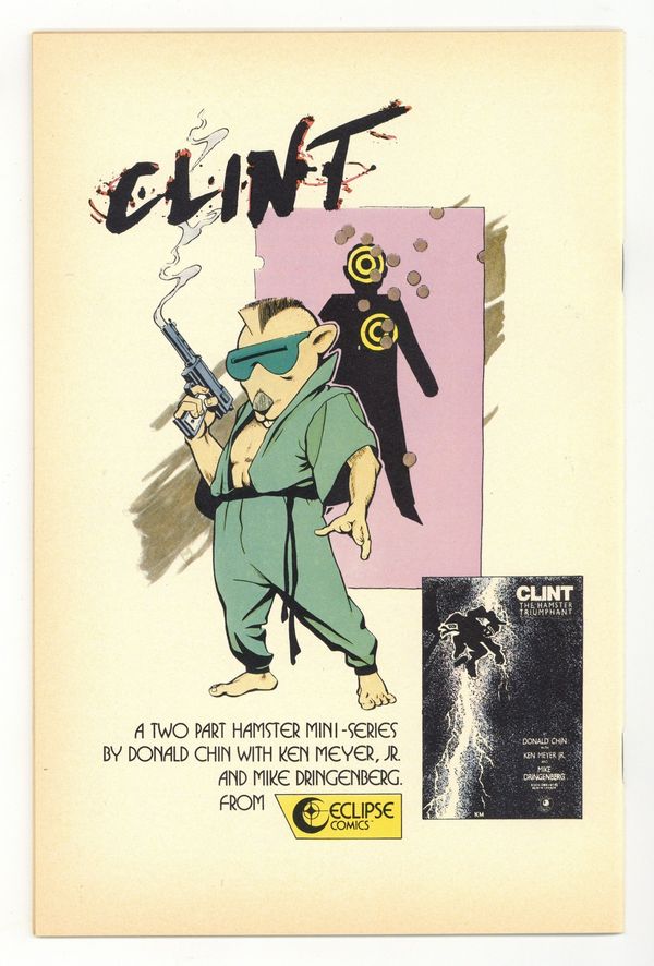 Starts Apr 4 They Want the Furs of the Adolescent Radioactive Black Belt Hamsters. Story by Don Chin. Art by Christopher Parsonavich. Cover by Mike Dringenberg, credited as Q87. One of the many martial-arts funny-animal comics that appeared in the wake of Teenage Mutant Ninja Turtles success, and nearly broke the comics industry. This one features hamsters with space-borne super-combat skills, and was the most popular, other than TMNT itself. On the run after accidentally destroying the Statue of Liberty, the Hamsters are aided by a woman from Clints past; the Pot-Luck Organization catches up with them at a theme park based on talking cartoon animals. Featuring an early cover by future superstar artist Mike Dringenberg. 32 pages, B&W. Cover price $1.50.