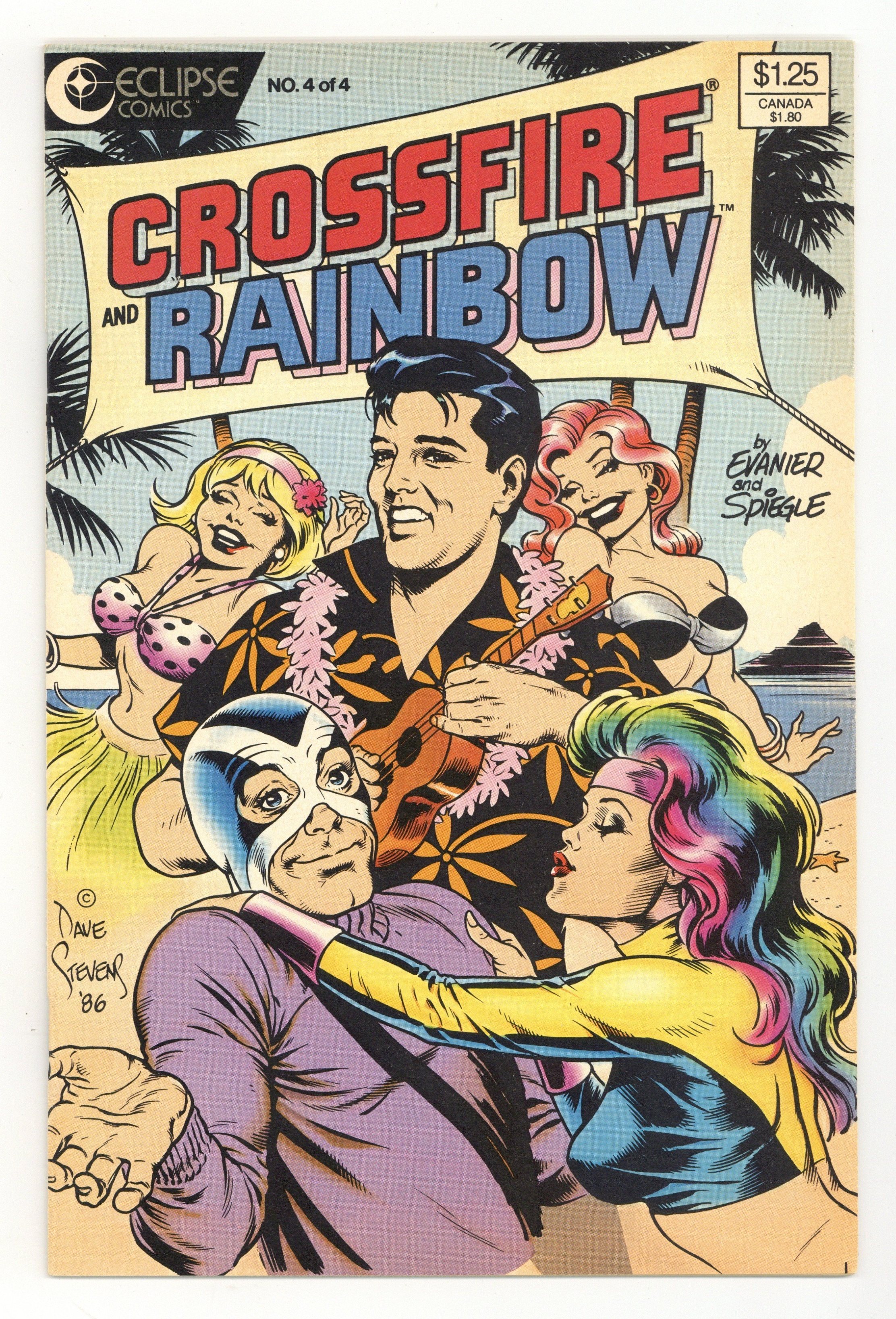 Starts Apr 27 Dave Stevens cover. With Jay in jail and blamed for the murder of a police officer, Rainbow tries to find the real killer in "This Isn't Elvis." Script by Mark Evanier and art by Dan Spiegle. Issue also has "Text Page" by Mark Evanier. Cover price $1.25.