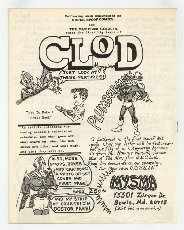 Starts Apr 27 Cover by Dick Mosso. Published by Chuck Wooley in 1968. Editorial content includes some British comic book history, plus "Fandom's Library" reviews by Larry Herndon. "For Sale" ad highlights include Amazing Fantasy 15 for $7, Avengers 1 at $3.50, and Tales of Suspense 39 for $4.35. Listed Golden Age ranges from Batman 14 at $8, to Top Notch 4 at $5, and Wonder Woman 10 at $3. Highlights also include a full page ad by My Comics Shop's very own Buddy Saunders, as well as detailed ads for the 1968 comic conventions in St. Louis and Dallas. The issue concludes with a full page Capt. America pin-up (never published previously) by Syd Shores, one of Cap's Golden Age artists. 8.5-in. x 11-in., 16 pages, B&W. Cover price $0.50. Cover price $0.50.
