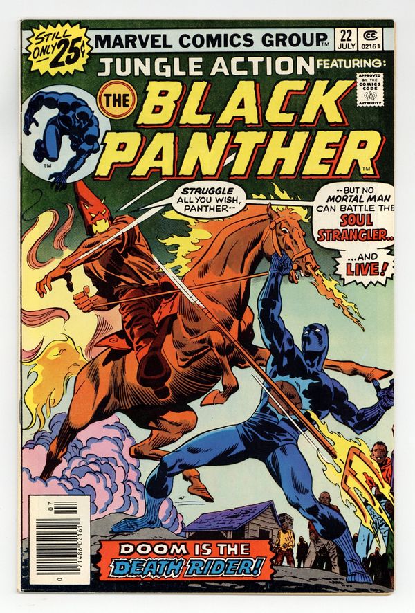 Starts Jan 19 Cover pencils by Rich Buckler, inks by Frank Giacoia. The Black Panther stars in the Panther versus the Klan part 4, "Death Riders on the Horizon, script by Don McGregor, pencils by Billy Graham (pages 1-5) and Rich Buckler (pages 6-17), inks by Bob McLeod (pages 1-5) and Jim Mooney (pages 6-17); Monica's mother tells a story of Klan raid during Reconstruction and Monica re-imagines it with the Panther present. Letters from comics creators John Rieber and Glenn Rowsam. 36 pgs., full color. Cover price $0.25.