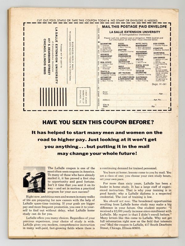 Starts Jan 19 Morbius finds himself rescuing a young woman when she's nabbed by a mysterious coven in "The Blood Sacrifice of Amanda Saint" (Story by Don McGregor, art by Rich Buckler and Pablo Marcos). In 1600s Salem, Massachusetts a young woman tries to escape a bloodthirsty mob after she's wrongfully accused of being a witch in "Witch Hunt!" (Story credits: unknown, art by Mannie Banks). An article about Bela Lugosi's other vampire roles aside from Dracula by Doug Moench. An adventurer named Simon Majors enters another dimension that serves a powerful being in "Five Claws to Tryphon" (Story by Gardner Fox, art by Jesus Blasco and John Romita). Article by Chris Claremont. First appearance of Satana, the Devil's Daughter in "Satana" (Produced by Roy Thomas and John Romita). Lou and Marie Fowler search for a secret fortune in a creepy house once owned by Lou's late uncle, but they get more than they bargained for in "At the Stroke of Midnight" (Story and art by Jim Steranko). Hodiah Twist investigates the death of a man who's been killed by vampires in "The Praying Mantis Principle" (Story by Don McGregor, art by Rick Buckler). JAD painted cover. Black and white, 74 pages. 75 cent cover price. Cover price $0.75.