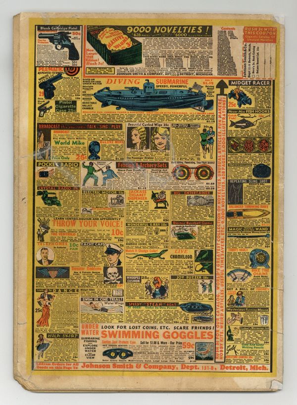 Starts Jan 3 Cover art by Lou Fine. "Prey of the Slavers," art by Alex Blum (as Alex Boon); Kaänga rescues Ann from the slaver, Blacton, and tells her how he came to live in the jungle. Untitled story, art by Taylor Martin; The White Panther is dispatched by his father to help Dr. White recover curative gems and to protect the Whites from Zaroff, an unethical competitor. "The Slave Raiders," script and art by Fletcher Hanks (as Henry Fletcher); In return for rescuing a witch doctor, Tabu is given a "six sense" and amazing powers which he uses to combat evil and injustice in the jungle. "Queen of the Lost Empire," art by C. A. Winter; Explorer Jon Dale discovers a lost city in the jungle, ruled by Queen Camilla; Daily human sacrifices are necessary for Camilla and her people to retain their immortality. Untitled story; Terry and his lancers are assigned to a fort, deep in the jungle, and are charged with interrupting the slave trade. Untitled story; Gunrunners sell guns to the natives in Wambi's jungle, which they then use to steal gold from local prospectors; Wambi reports the crimes to the local constabulary who defeat the natives. Untitled story; Cog bails out petty criminals Buck, Rex, and Slim to use as overseers of his safari; Cog drives the natives too hard and they rebel. Untitled story; Aging Simba saves the life of his rival, Slita and then barely manages to prevent being usurped by the younger Slita; Simba concedes his pride Slita and departs. Untitled story; Safari guide Buck Barton infiltrates a leopard cult to rescue his client. 68 pgs., full color. Cover price $0.10.