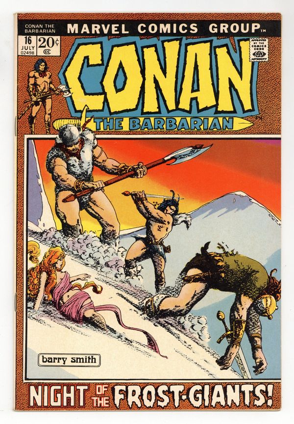 Starts Apr 27 Cover art by Barry Windsor-Smith. The Frost Giant's Daughter, script by Roy Thomas, art by Barry Windsor-Smith; setting: Snowy battlefield; Conan chases Atali across the snow, slays her two frost giant brothers, and catches her; Her father, Ymir then takes her from Conan. This story originally appeared in Savage Tales 1, but for its publication here Windsor-Smith added another page (a new splash page), and some panels and dialogue were altered for Comics Code approval. Back-up reprint story: The Sword and the Sorcerers (from Chamber of Darkness 4), script by Roy Thomas, art by Windsor-Smith. Also in this issue: a full-page reprint of the Hyborian Age map from Conan 1. 36 pgs. Cover price $0.20. Cover price $0.20.