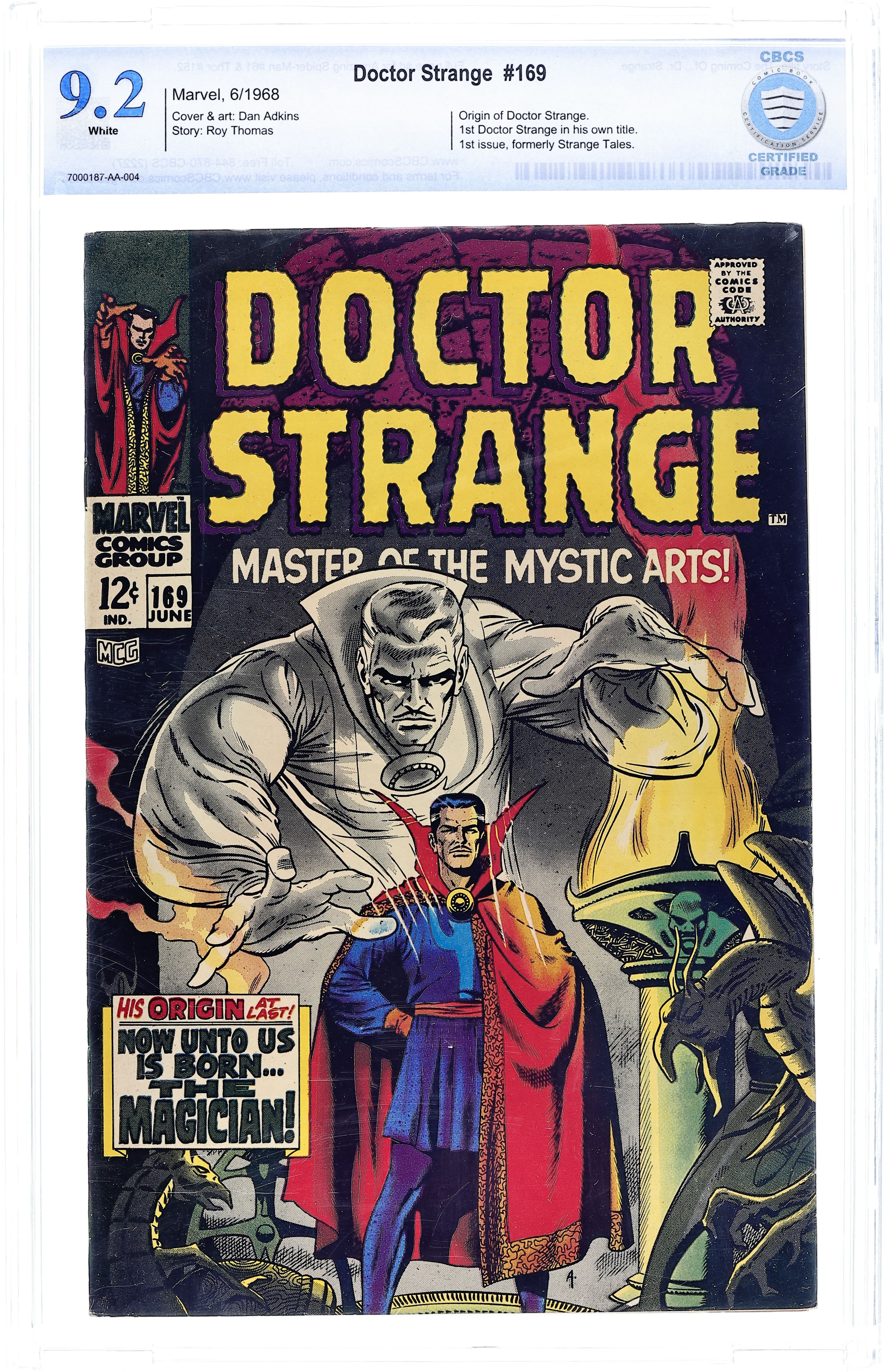 Comic book version of the classic pulp magazine hero Doc Savage. Issue features "The Man of Bronze," part one of an adaptation of the Kenneth Robeson novel of the same name in which Doc and his team try to track down who killed his father. Issue also has a one-page text feature on Doc Savage's team members. Script by Roy Thomas and Steve Englehart and art by Ross Andru and Jim Mooney. Cover price $0.20.
