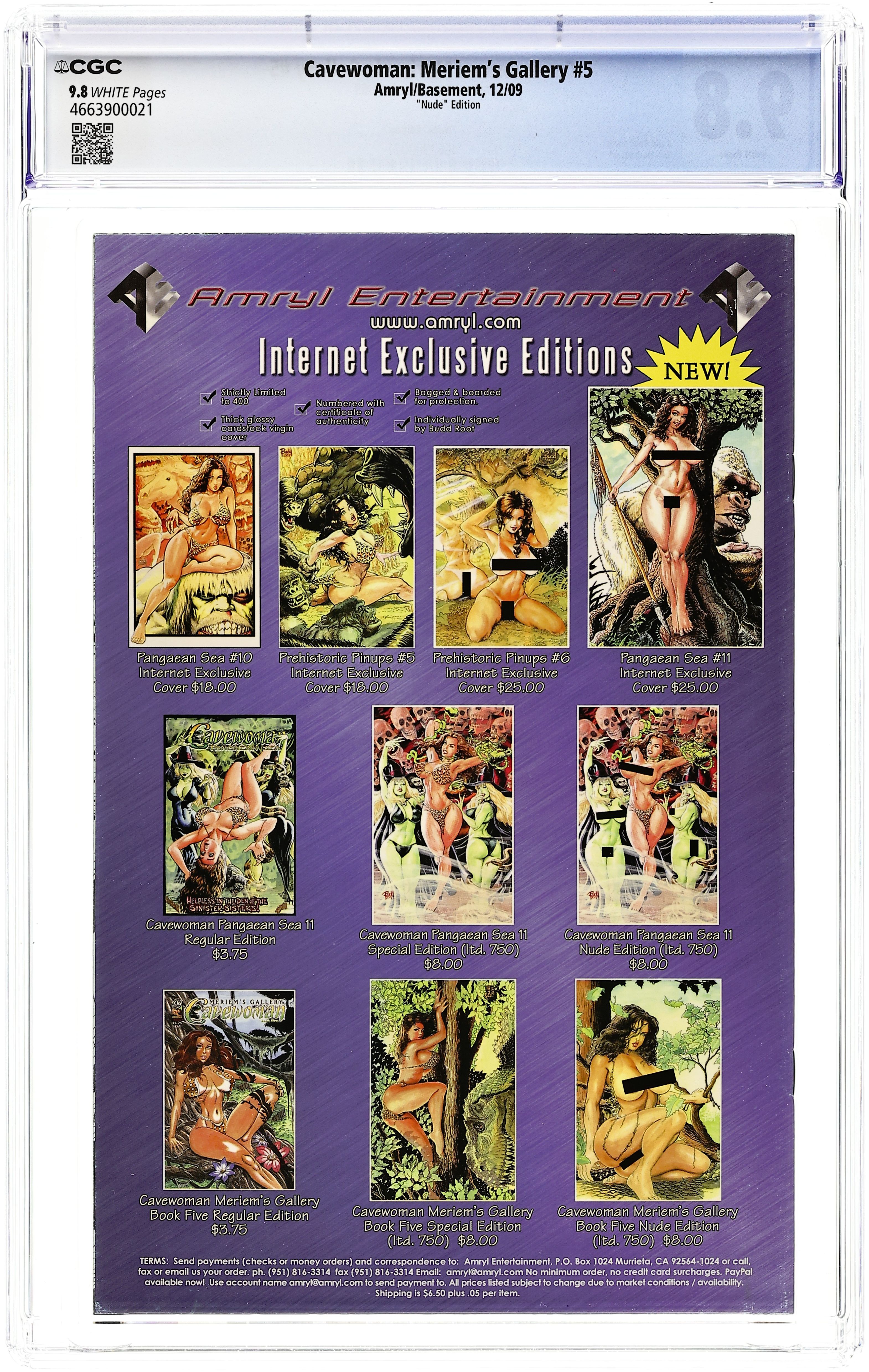 Nude Special Edition. Limited to 750 copies. Includes Amryl Entertainment Certificate of Authenticity. Art by Rob Durham. Coming off the hit Cavewoman one-shot book Red Menace, Rob takes over the art duties from Devon for the return of Meriem's Gallery! Book 5 is here with all new pin-up artwork sure to please any Cavewoman fan, so please welcome Rob as he continues the Meriem's Gallery tradition of fantastic (and often risqué) Cavewoman artwork! Mature readers.