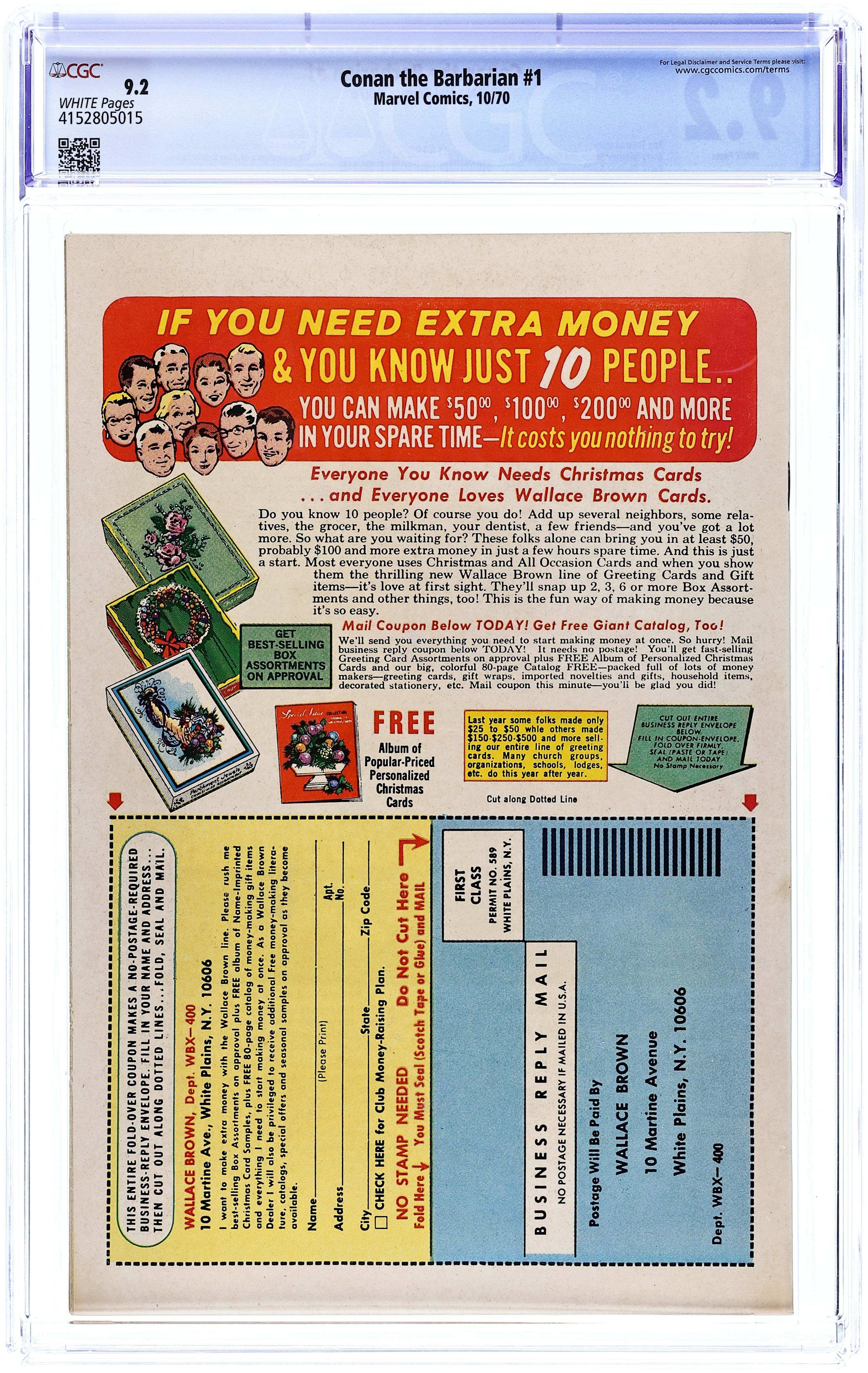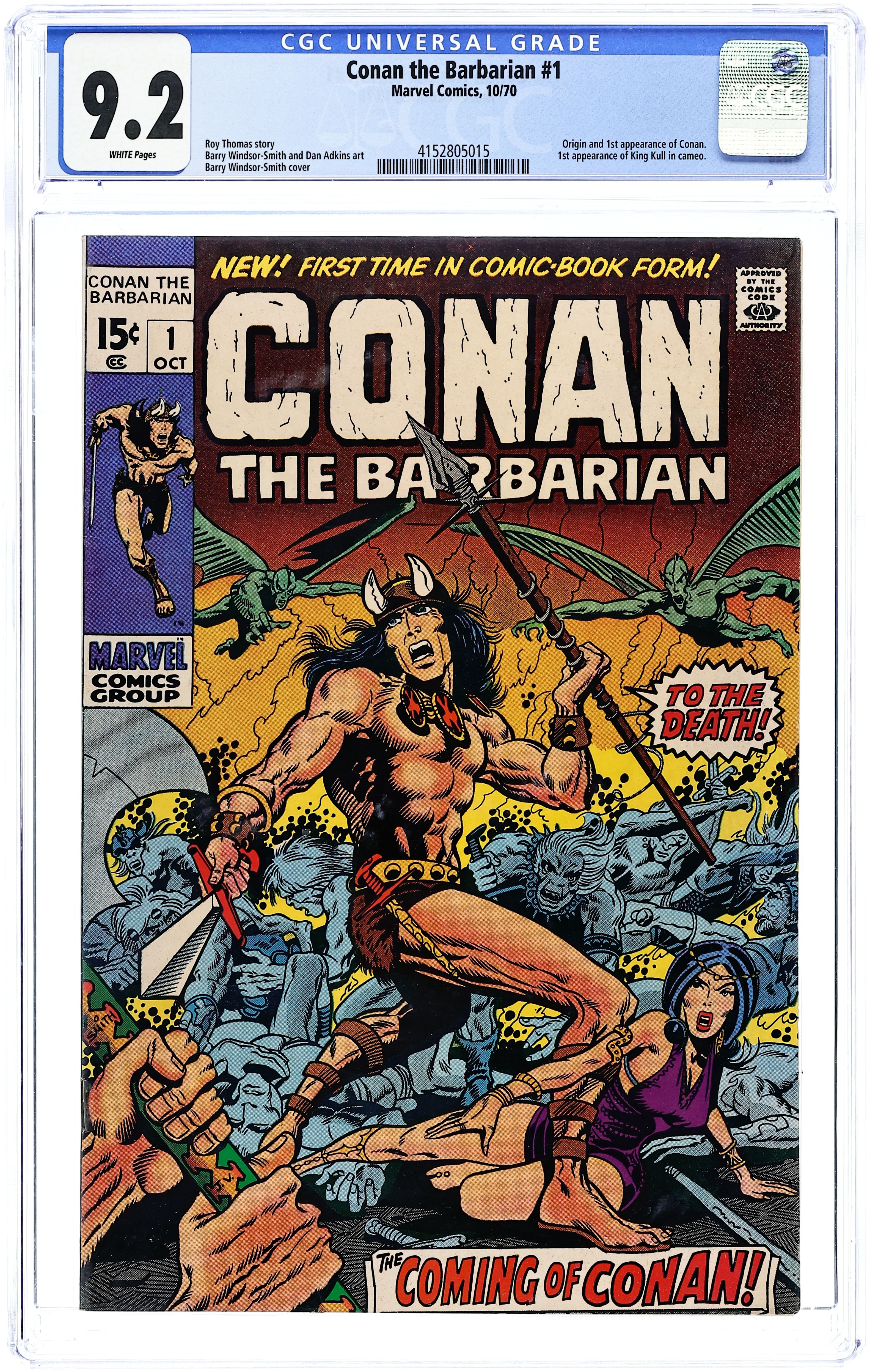 Cover pencils by Barry Windsor-Smith, inks by John Verpoorten. First comic book appearance and origin of Conan. The Coming of Conan!, script by Roy Thomas, pencils by Barry Windsor-Smith, inks by Dan Adkins; Conan battles at Vanaheim and sees his future; Tara returns to her dimension 1st comic book appearance of Kull (cameo). The letters page contains a map of Conan's world of the Hyborian Age drawn by Windsor-Smith (based on Robert E. Howard's own version) and a short essay on The World of Conan. 36 pgs. Cover price: $0.15. Cover price $0.15.