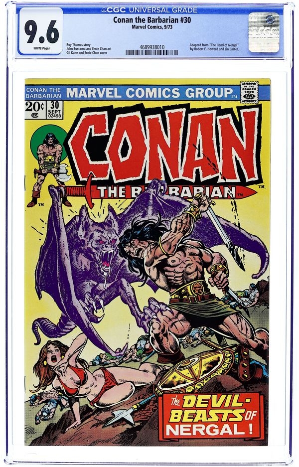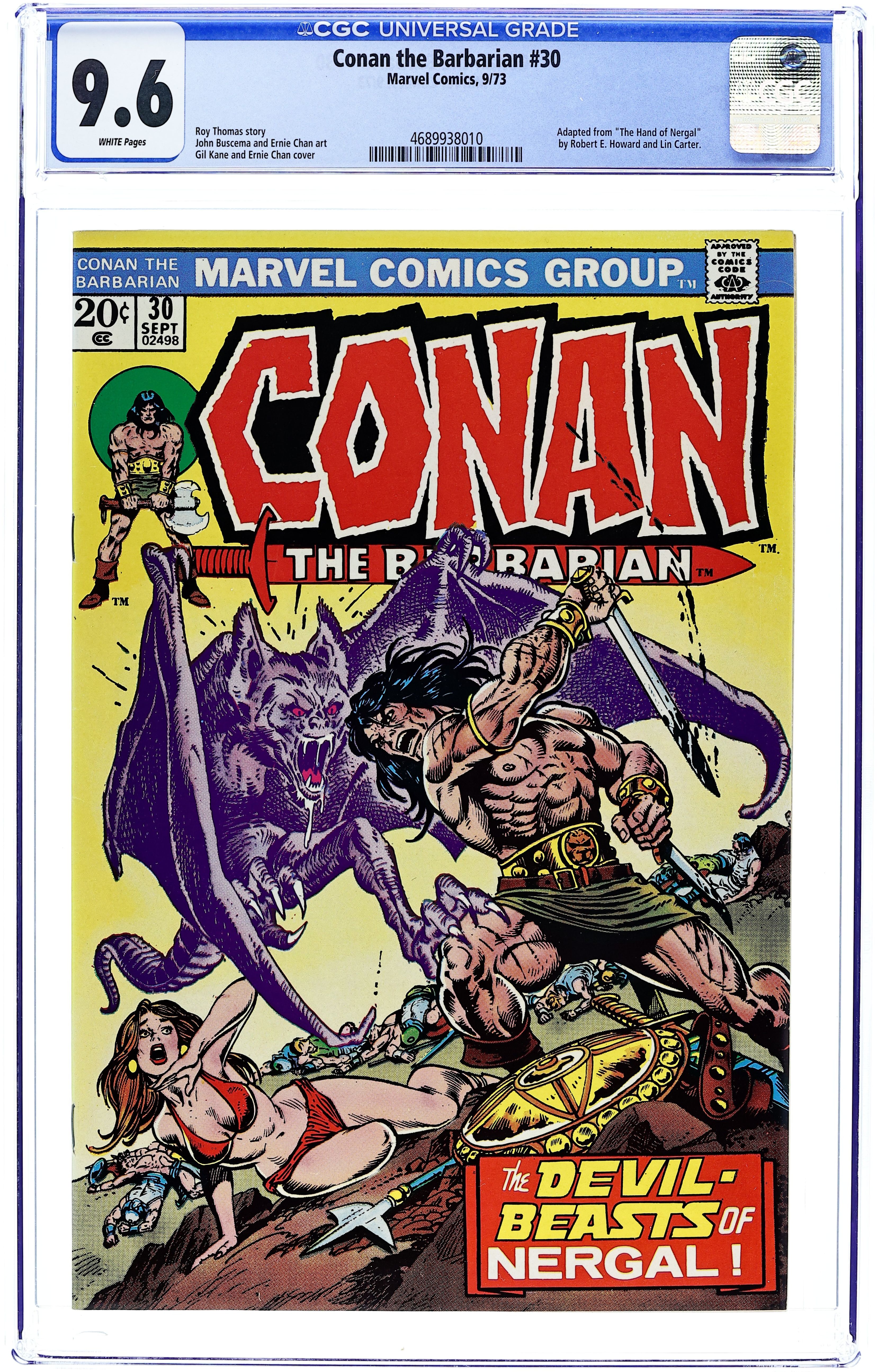 Cover pencils by Gil Kane, inks by Ernie Chan. The Hand of Nergal, script by Roy Thomas, pencils by John Buscema, inks by Ernie Chan [as Ernie Chua]; setting: Battlefield & City of Yaralet; Conan fights in the Turanian army against the legions of Munthassem Khan; Conan rides off with Hildico in epilogue; adapted from the story by Robert E. Howard and Lin Carter. 36 pgs. Cover price $0.20. Cover price $0.20.
