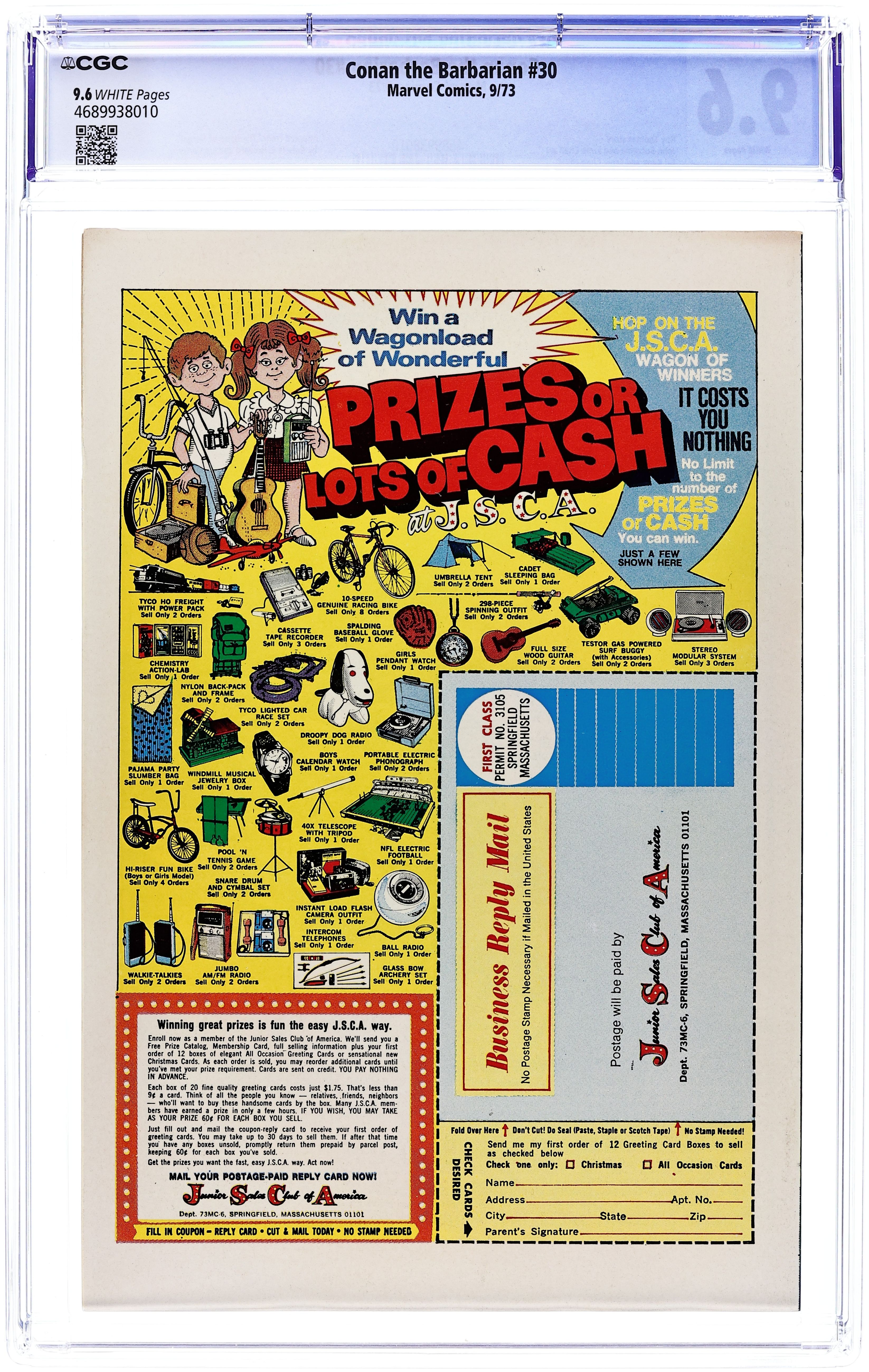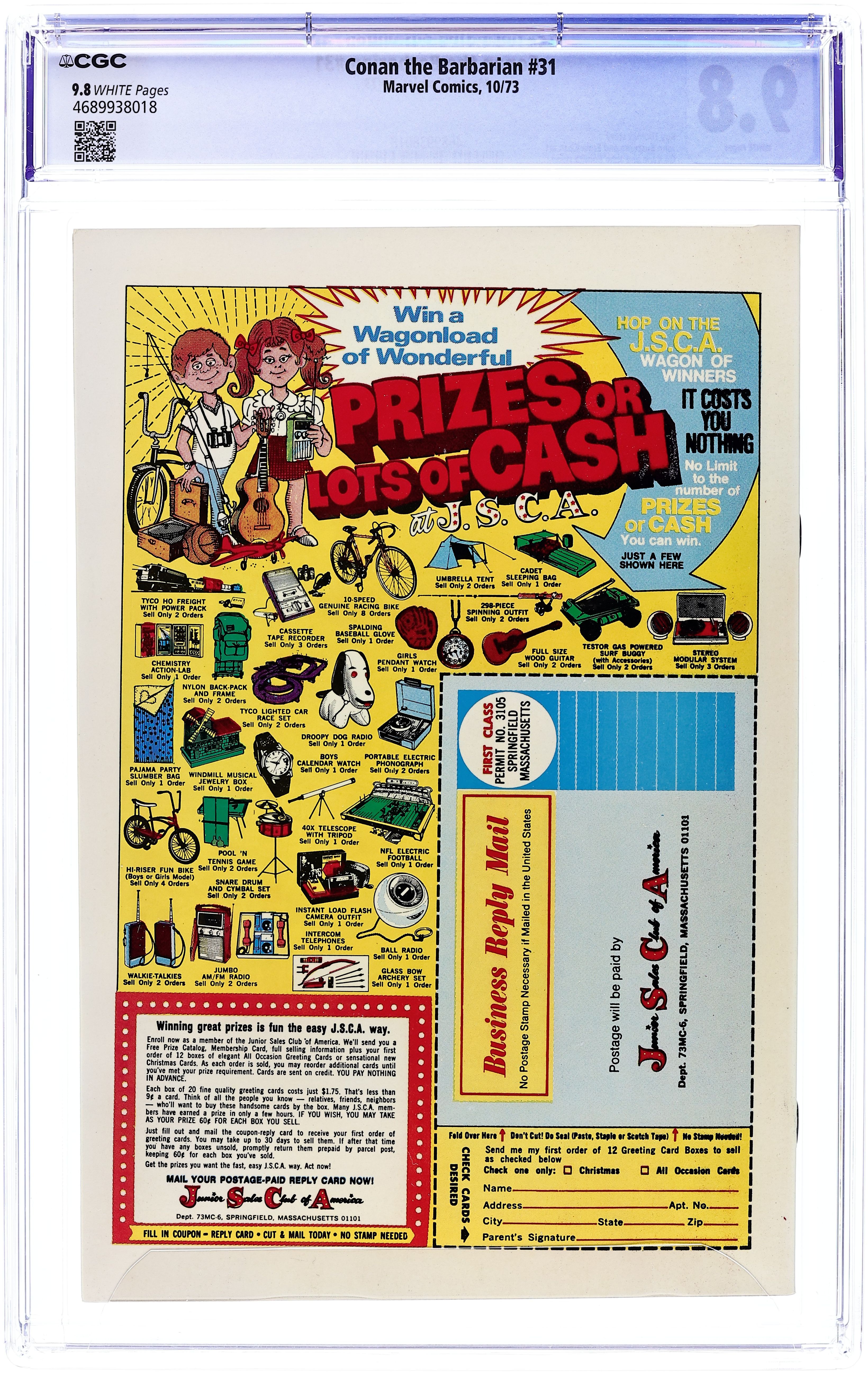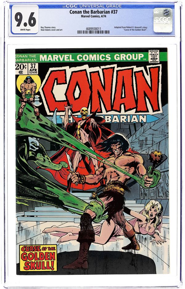 Last 20-cent issue. Cover art by Neal Adams. The Curse of the Golden Skull, script by Roy Thomas, art by Neal Adams; setting: Northen wastes of the Hill-men & city with crystal tower; Conan & Juma fight a giant slug & rescue Yolinda from Rotath; 3-page prologue introduces Rotath; adapted from the non-Conan story by Robert E. Howard. First comic book appearance of Juma, a character by Lin Carter and L. Sprague De Camp. The letters page contains Marvel Value Stamp Series A # 8 (Captain America by Buscema). 36 pgs. Cover price $0.20. Cover price $0.20.