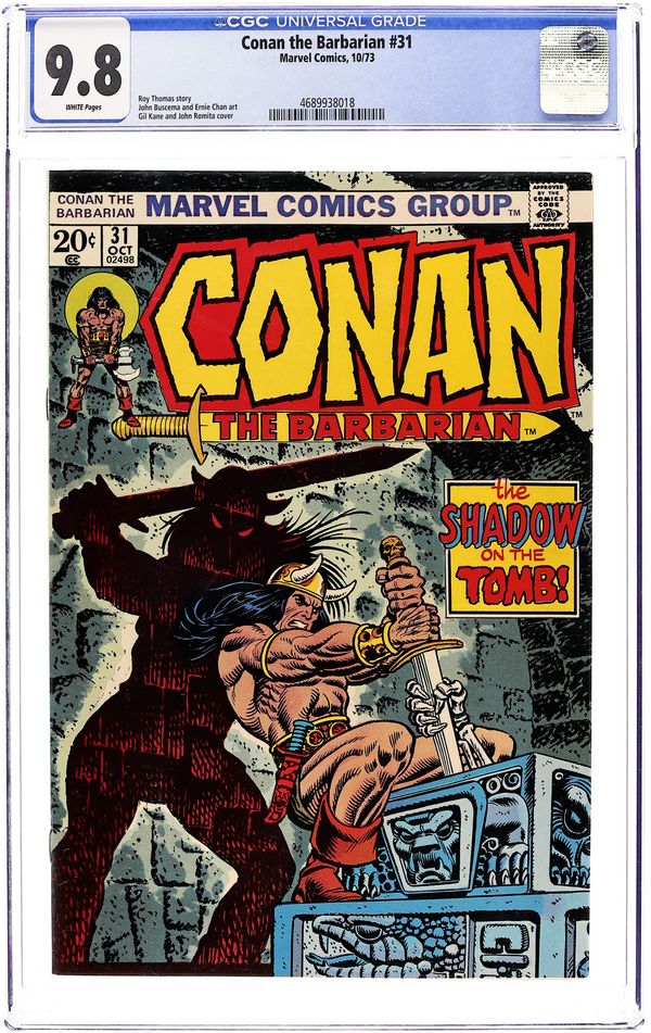 Cover pencils by Gil Kane and John Romita (shadow re-pencilled), inks by John Romita. The Shadow in the Tomb, script by Roy Thomas, pencils by John Buscema, inks by Ernie Chan [as Ernie Chua]; setting: Hilly Countryside; Conan fights in the Turanian army against the Hill-Men; Conan fights his shadow; Nice twist at end--pay attention to the sword in the last panel. 36 pgs. Cover price $0.20. Cover price $0.20.