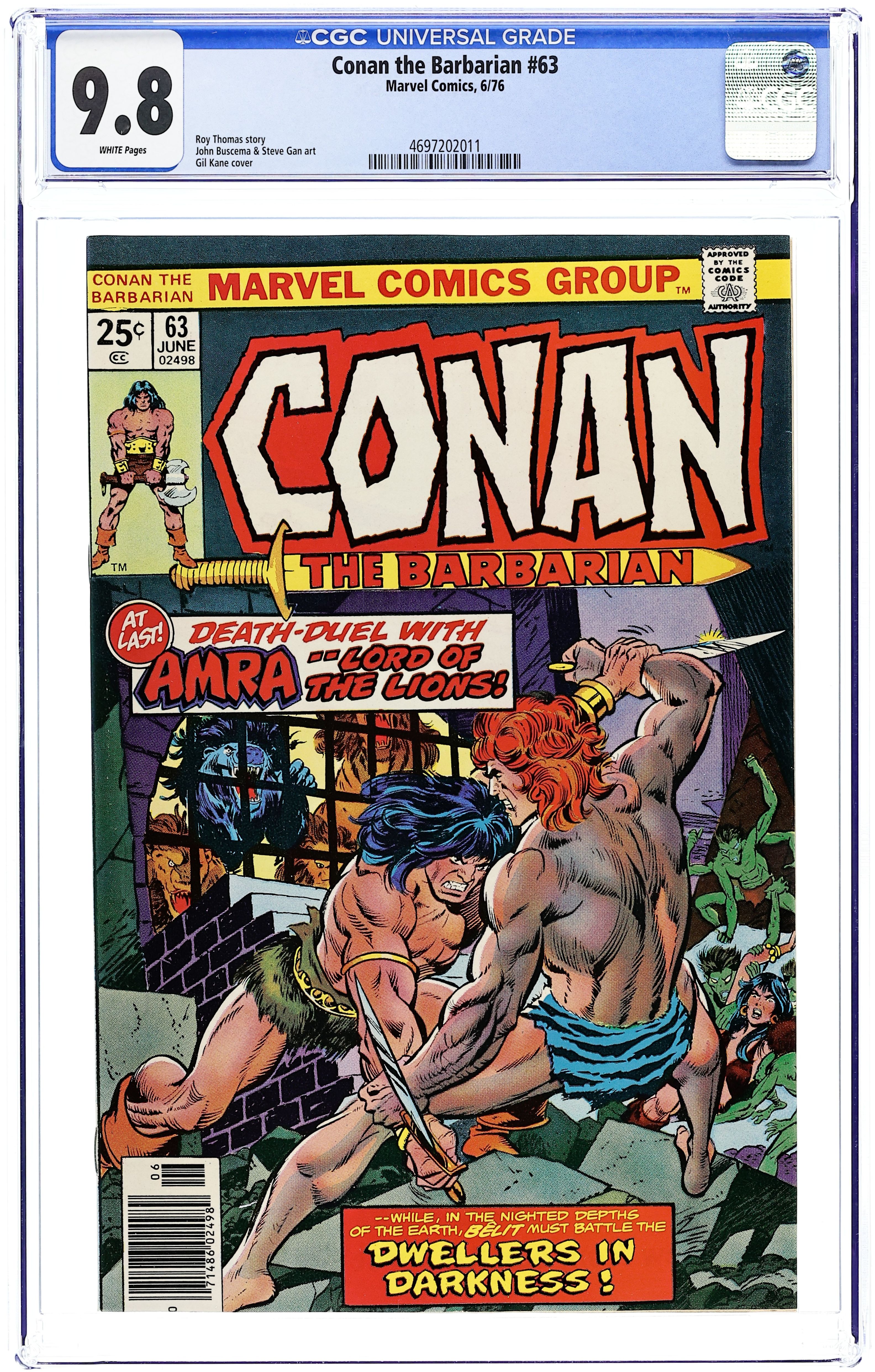 Cover pencils by Gil Kane, inks by Tom Palmer. A Shadow on the Land, script by Roy Thomas, pencils by John Buscema, inks by Tom Palmer; setting: City of Ronnoco, Plain of Shamu; Conan battles Shadow and Scorpion and saves the city of Ronnoco. 36 pgs. Cover price $0.25. Cover price $0.25.