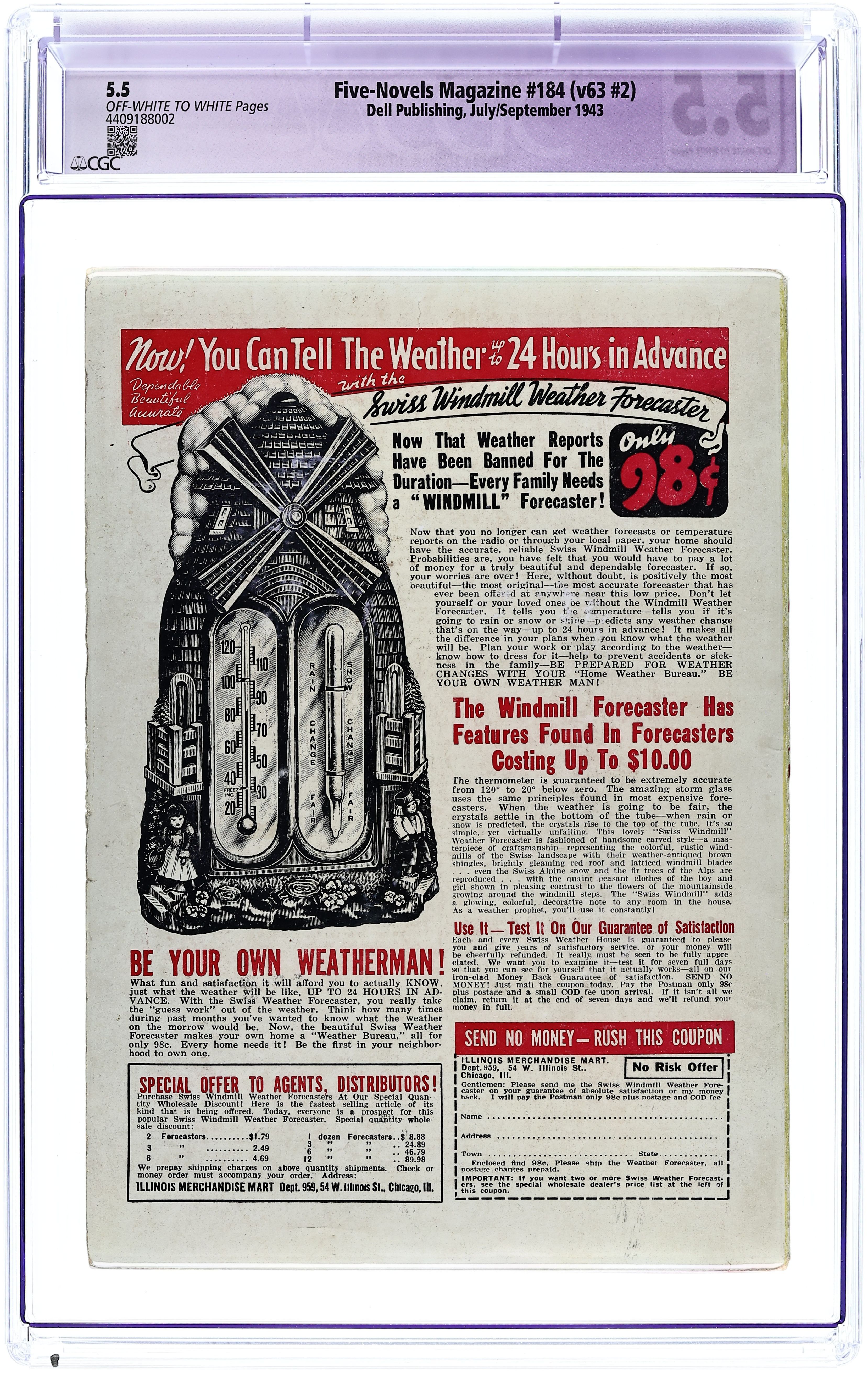 Published Sep 1943 by Clayton Magazines, Inc..Five-Novels Monthly/Magazine (1928-1948 Clayton/Dell) Pulp Vol. 63 #2 CGC 5.5 Restored