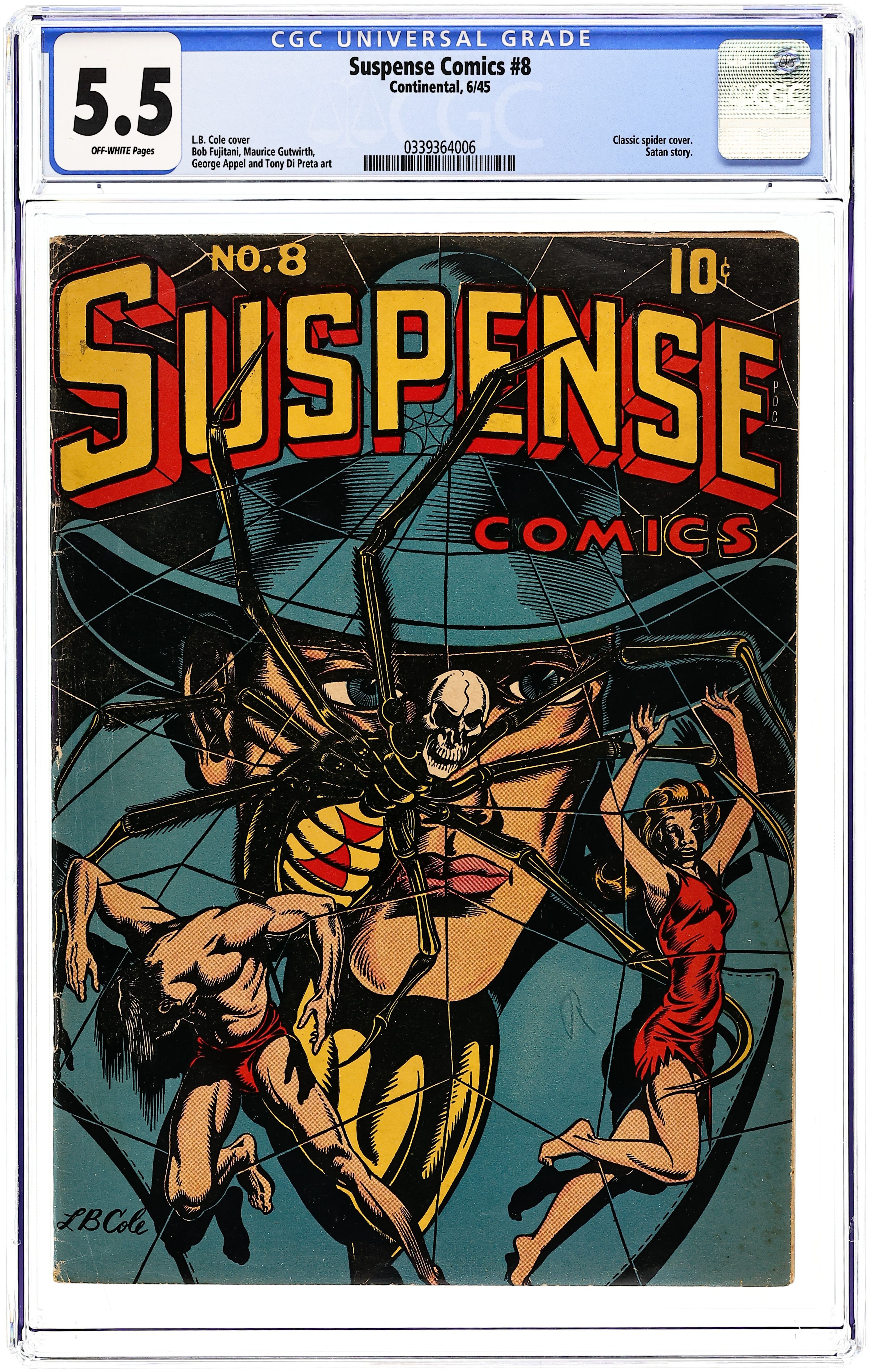 Classic L.B. Cole spider cover. 1000 to 1 starring Mr. Nobody. Sherry Flippe, art by Tony DiPreta. Class Reunion. Satan, art by G. H. Appel. Candidate for a Coffin. The Face of Death, art by Maurice Gutwirth. The Grey Mask and the Dove, art by Bob Fujitani [as Bob Fuje]. Murder in the Hurricane: Chapter One text story by Julia Gwin. 52 pgs. $0.10. Cover price $0.10.