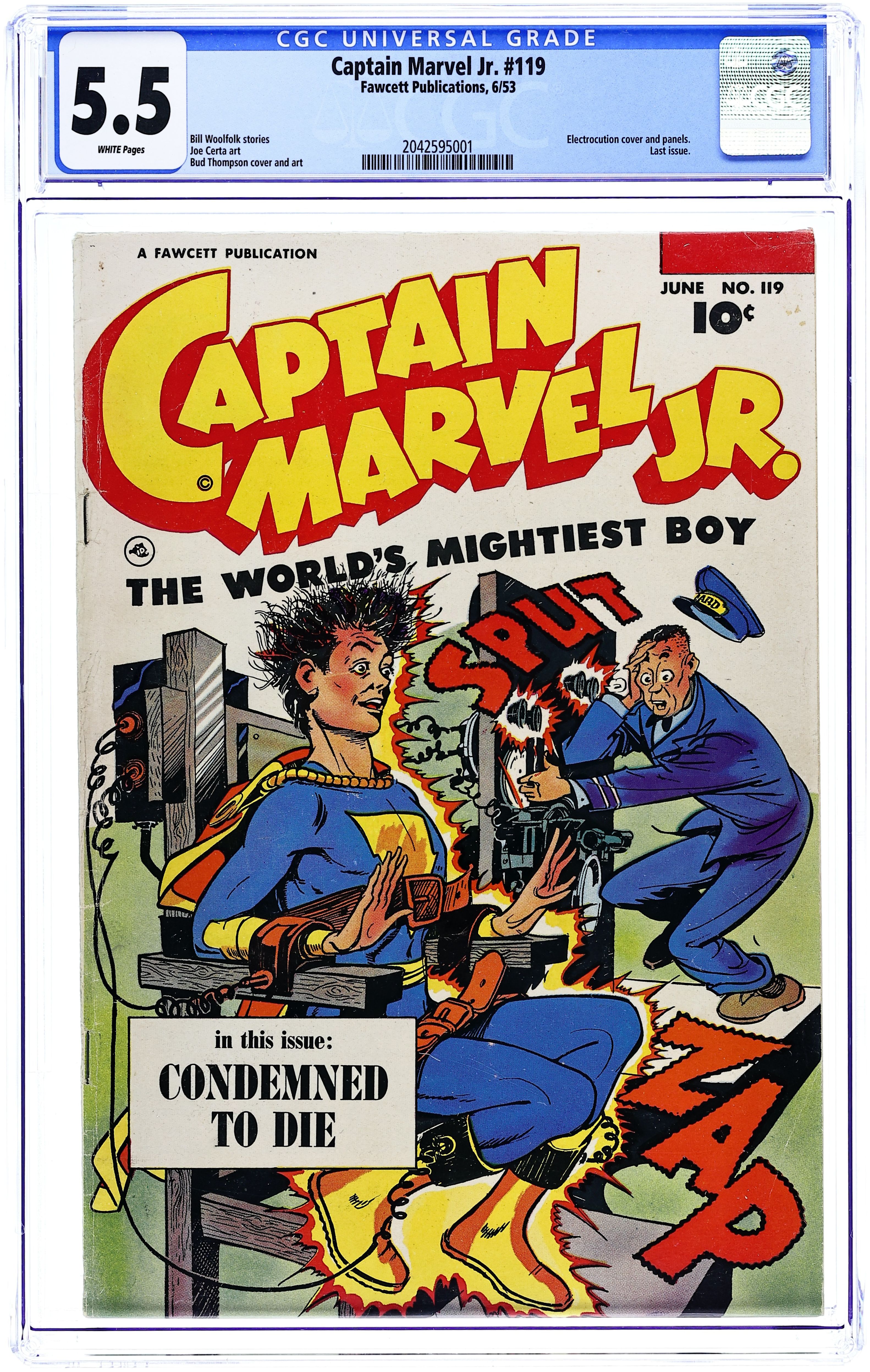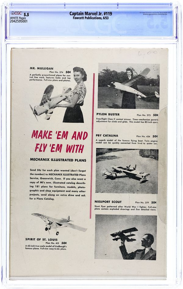 Stories and art by Otto Binder, Kurt Schaffenberger and Howard Boughner. Fawcett's most popular heroes, the original Captain Marvel (Shazam) and family, in solo and shared adventures. In an issue-length, multi-part adventure, The Marvel Family travels to the future year of 1960. There they find atomic-powered rocketships, a force of space cops, and space conquerors seeking an interstellar empire - just like the real 1960s. The Great Space Struggle, Chapter One: Peril Over Planet Prep; Yellow Kid; Lazy Lee; Boxcar Benny; The Marvel Family Puzzle Page; Chapter Two: The Sivana Sabotage; Headline Harry: The Worm Turns; Podges and the Pill Roller; Chapter Three: Battle in Space. 32 pages, Full Color. Cover price $0.10.