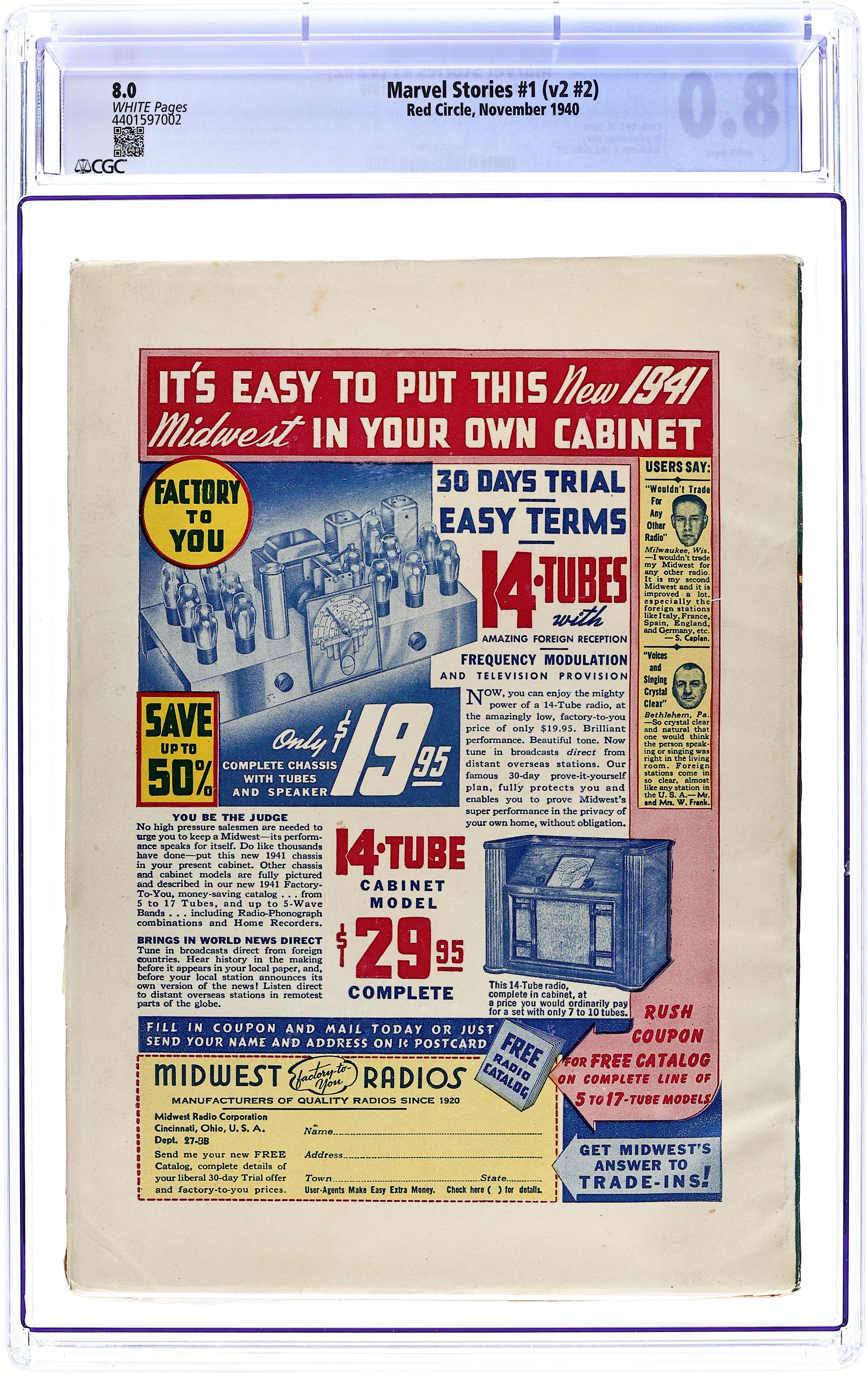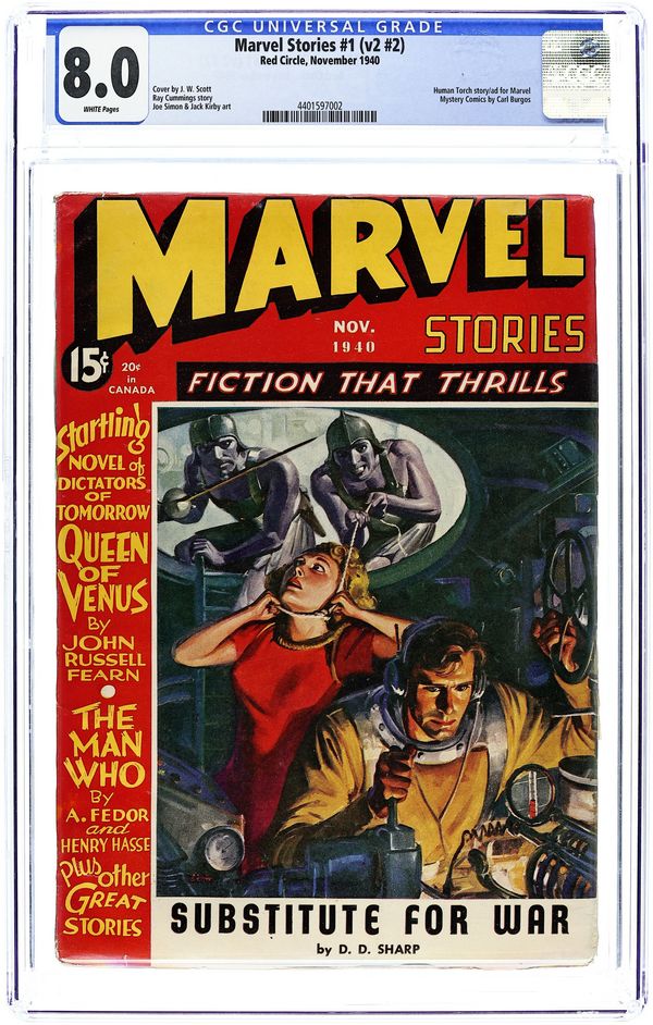 Vol. 2, No. 2 - November 1940. Interior illustrations by Simon and Kirby, Human Torch short picture story on pg. 104. See See Marvel Science Stories (1938-1939 Postal Publications) Pulp 1st Series and Marvel Tales (1939-1940 Western Fiction) Pulp for earlier issues. 6.75" x 9.75", 114 pages, B&W. Cover price $0.15.