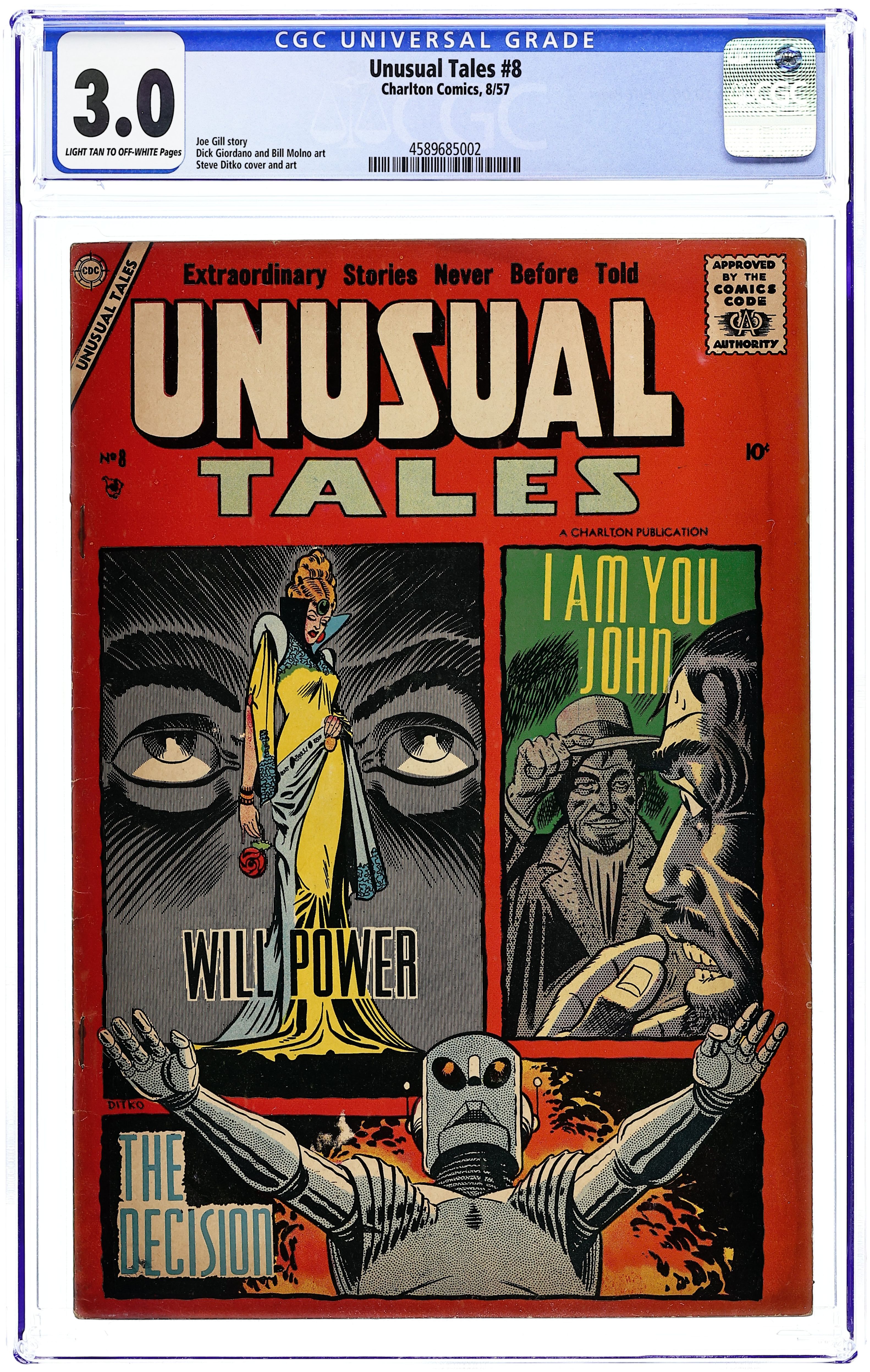 Cover by Steve Ditko. Stories and art by Steve Ditko, Dick Giordano, Joe Gill, Rocco "Rocke" Mastroserio and Bill Molno. Strange stories of science fiction, fantasy and horror that fit within the guidelines of the new Comics Code. In one of two stories this issue with art by Spider-Man co-creator Steve Ditko, a sculptor brings a statue of a woman to life with sheer will power, but there's a twist that involves a truly creepy Ditko image. In another Ditko story, advanced robots are awakened from storage, but maybe that wasn't the best idea. Harry refuses to reveal his secret to defying gravity. Another classic cover by Ditko. Will Power; The Decision; The Great Gift; Werner's Dream Car; I Am You, John; All Eyes Are Riveted; Going Up. 32 pages, Full Color. Cover price $0.10.