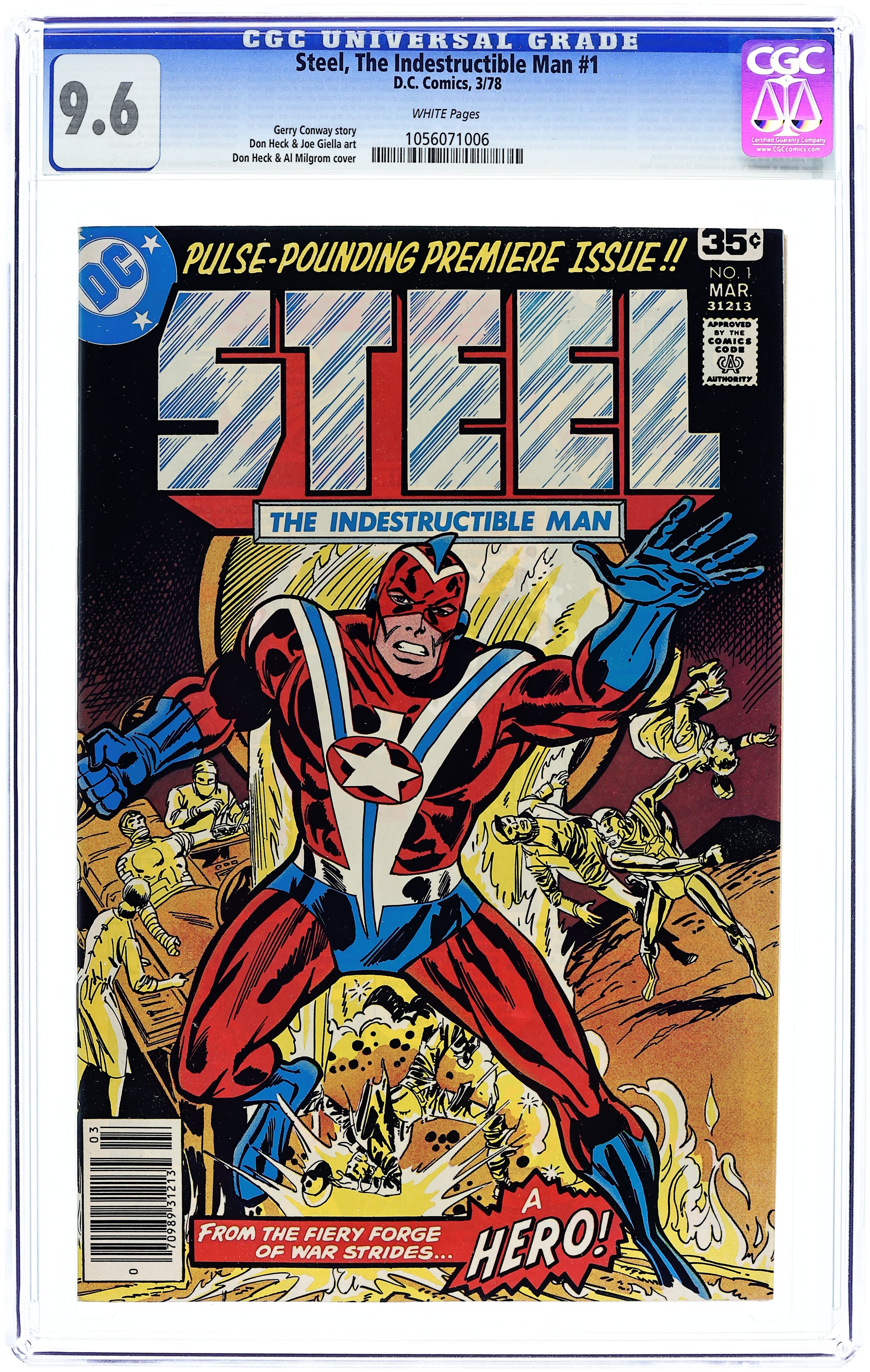 Cover pencils by Don Heck, inks by Al Milgrom. "From Hell Is Forged... a Hero!", script by Gerry Conway, pencils by Don Heck, inks by Joe Giella; First appearance of the original Steel, grandfather of the second Steel and Citizen Steel; Origin story of Steel in 1939 before America enters into war during World War II (WWII); As a civilian Hank goes to Germany and sees a Jewish man receive a beating and fears that the old man was later killed after he left; When he arrives back to the States, he finds that Germany has invaded Poland and he leaves Princeton to join the United States Marines; His girlfriend Gloria Giles (intro) is against his decision and leaves him for that decision, but it is soon after entering the war that that he is blown up trying to stop some saboteurs; This is when Gloria decides to come back and Steel is rebuilt to comeback from his injuries; This turns him into a super-powered being; vs. Baron Death (intro). 36 pgs., full color. Cover price $0.35.