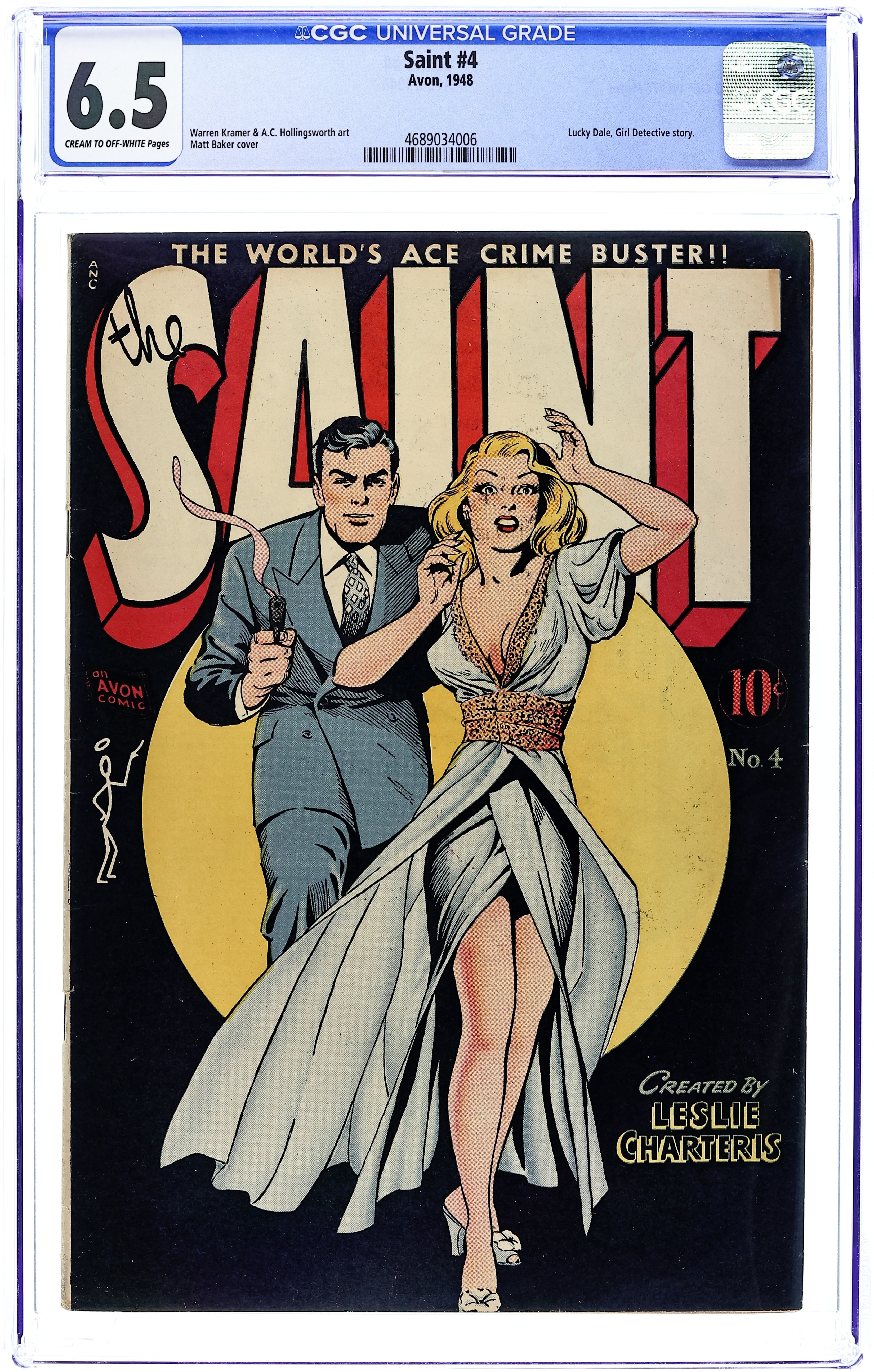 Stories by Walter Johnson and others. Art by Warren Kremer, Alvin Hollingsworth and Walter Johnson. Cover by Matt Baker. The first comic book featuring Leslie Charteriss adventurer Simon Templar, better known as The Saint, timed to coincide with the concurrent Saint radio show starring Vincent Price. The Saint stalks a killer backstage at a pirate play; Photojournalist Flash Harper catches an arsonist in action in his latest photo; Lucky Dale, Girl Detective, finds danger at sea while vacationing on a houseboat. Also featuring a Flash Harper story and a classic cover by legendary good-girl artist Matt Baker. The Saint Steals the Show; Operation Blackout: The Mole; Terror in the Night; Do You Know?; The Saint Plays Nursemaid! 32 pages, Full Color. Cover price $0.10.