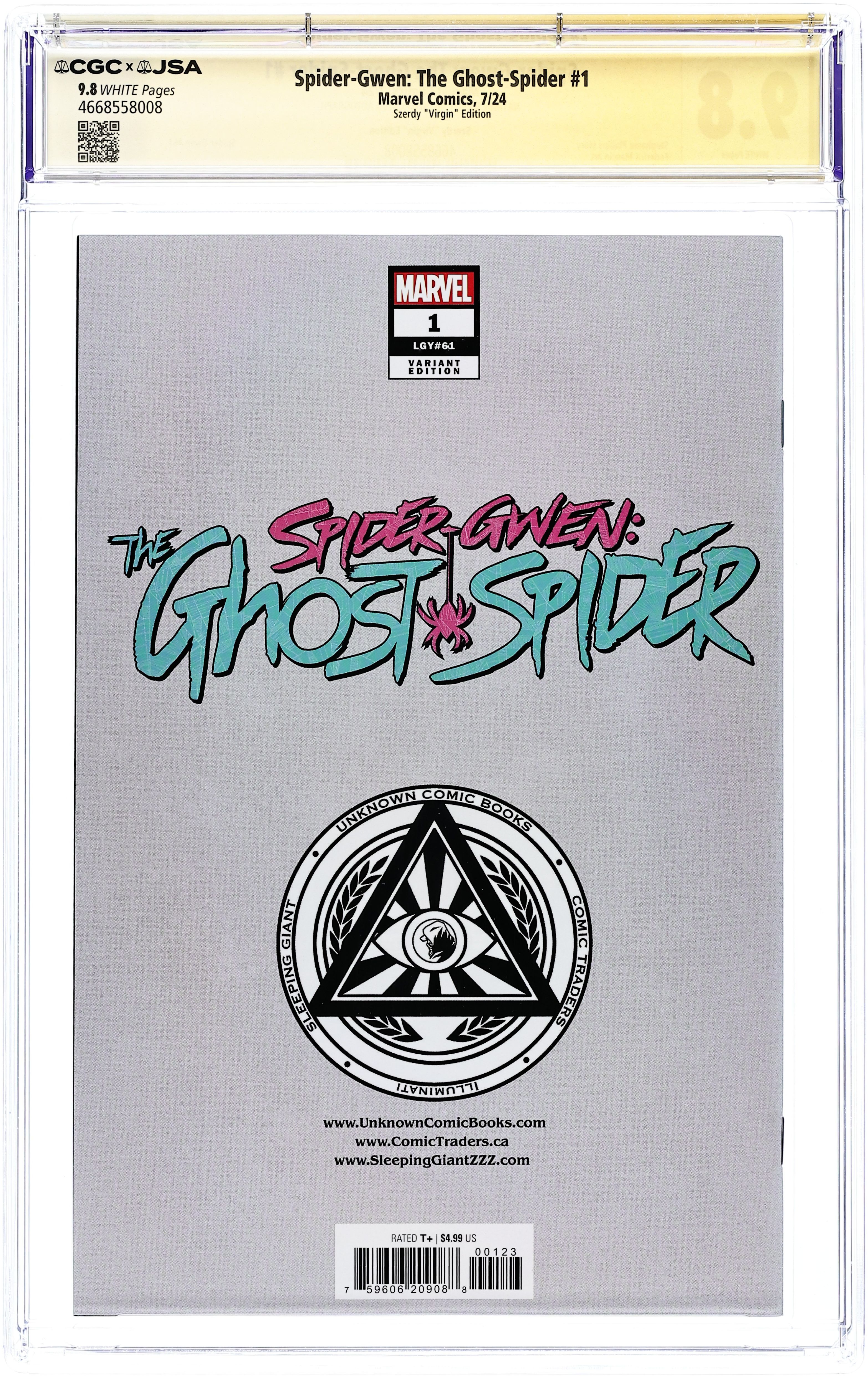 Comics Illuminati (Unknown Comic Books, Comic Traders, and Sleeping Giant) Exclusive Virgin Cover by Nathan Szerdy. Written by Stephanie Phillips. Art by Chris Campana. TRAPPED IN THE 616...FOR GOOD! Welcome to New York! Gwen truly becomes a Ghost-Spider when she moves full time to the universe where Gwen Stacy died years ago. But why did she leave Earth-65? Why aren't the other spiders supposed to know she's here? Why isn't she supposed to suit up? And who will get hurt when she does? 36 pages, full color. Rated T+