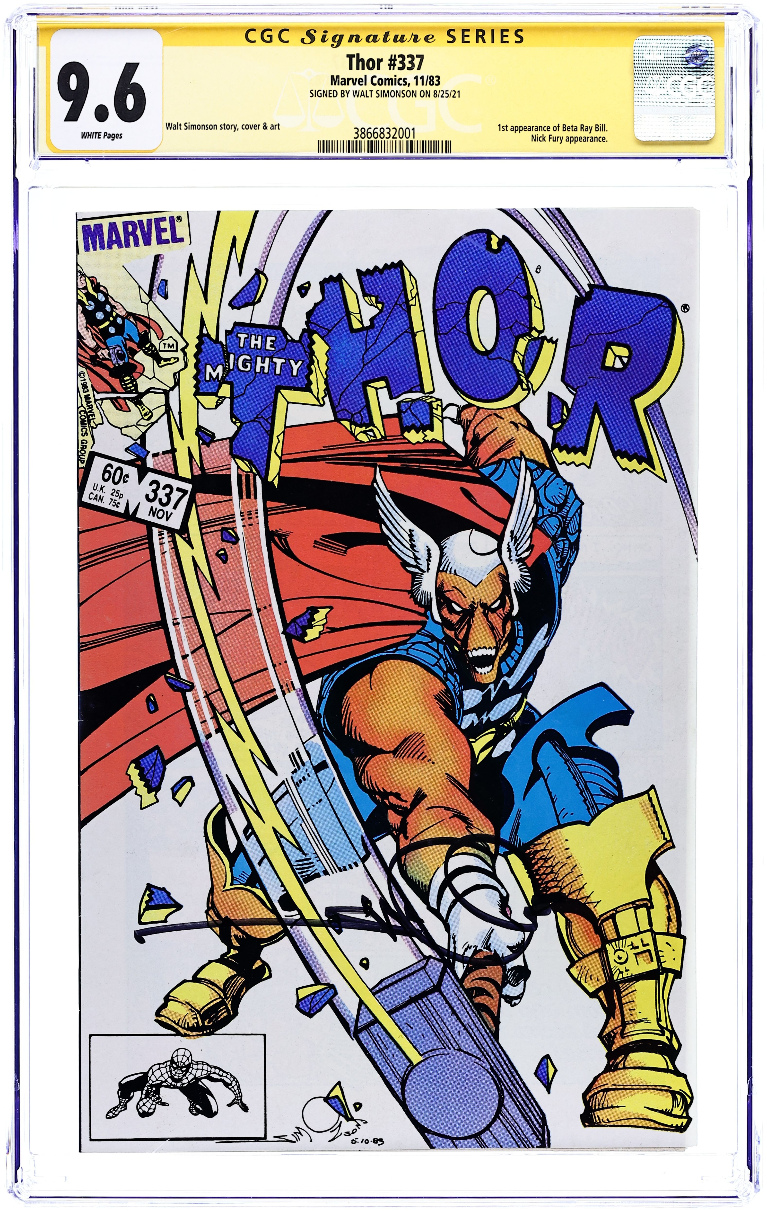 Ends Mar 30 9:47 PM CST Bid History 6 bids Current Bid $12 Your Secret Max Bid If you'd like to bid, please log in or register. Newsstand Edition. Cover pencils by Ron Frenz, inks by Al Milgrom. The present-day Thor, the future Thor (Dargo), and Beta Ray Bill form the Thor Corps in The Thor War part 3 of 4, "All The Rivers Run!"; The Thor Corps battles Zarrko in the time stream. Zarrko brings various Thor villains from the past to fight the three Thors. Tales of Asgard back-up, "By Mine Own Heart Betrayed," script by Tom DeFalco, art by Patrick Olliffe; The Destroyer defeats Gar-Toom and Sif learns that it is not the soul of Thor that is inside the Destroyer armor. Bullpen Bulletins. 36 pgs., full color. $1.00. Cover price $1.00.