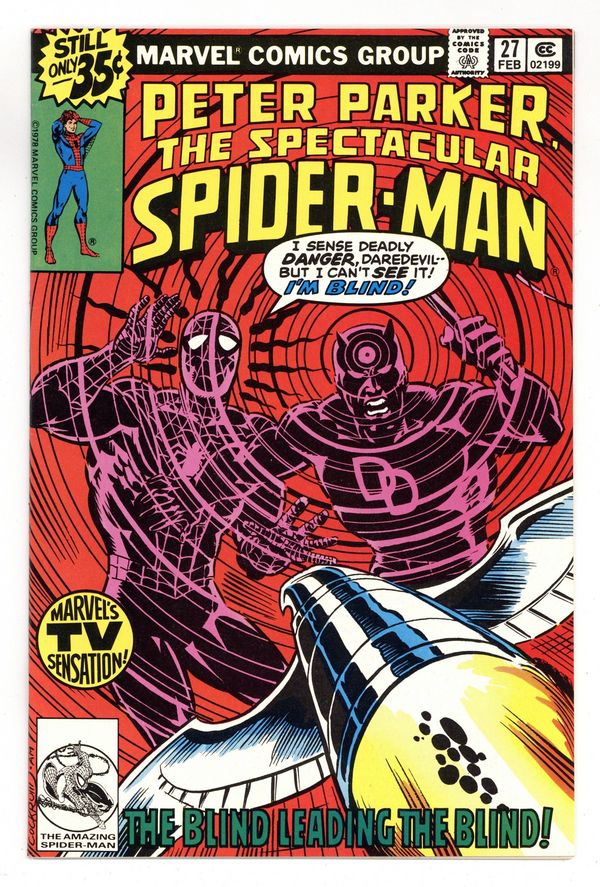 $17.001993 reprint available only through JC Penney. "The Blind Leading The Blind" Guest-starring Daredevil. Script by Bill Mantlo. Pencils by Frank Miller (1st work on Daredevil). Inks by Frank Springer. Cover by Dave Cockrum and Al Milgrom. One of the classic issues of the bronze age. Two blind super-heroes are on the trail of the Masked Marauder and the Tri-Man! Can Daredevil lead Spider-Man to the secret lair of the Maggia? The Man Without Fear and the web-slinger must hurry, because the Masked Marauder is set to launch his atomic bombdroid to destroy the city! Cameo appearances by Mary Jane Watson and Carrion. NOTE: Has low print run. Can be identified by having the words "The Amazing Spider-Man" printed in the UPC box. Cover price $0.35.