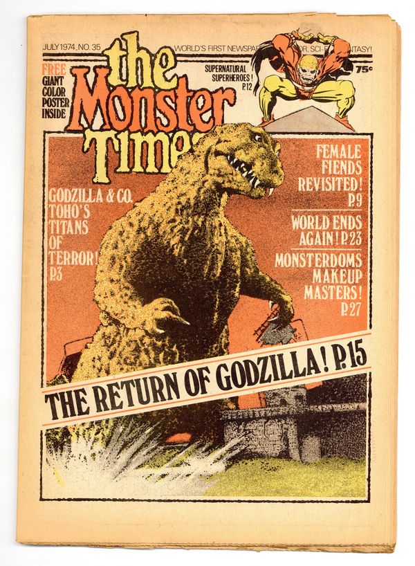 No. 35 - July 1974. The World's First Newspaper of Horror, Sci-Fi and Fantasy! This issue: The Return of Godzilla! Godzilla & Co. - Toho's Titans of Terror! Supernatural Superheroes! Female Fiends Revisited! World Ends Again! Monsterdom's Makeup Masters! Plus - Free Giant Color Poster Inside. 11.5" x 16.5", 32 pages, B&W. Cover price $0.75.