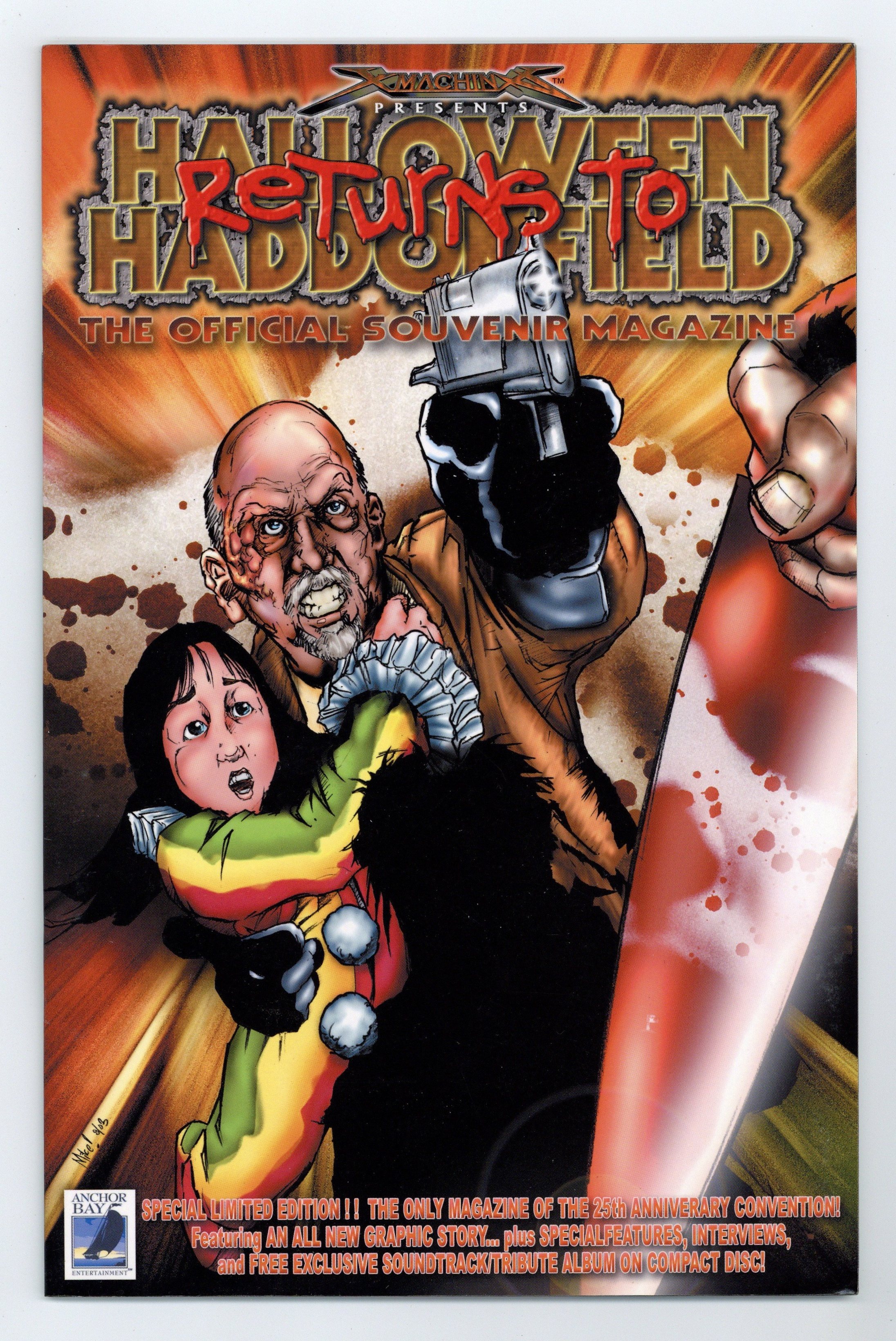 Includes music CD. 25th Anniversary Convention Official Souvenir Magazine. Limited to 2,000 copies. Features an all new eleven page comic, a 10 page alumni section presenting a scrapbook look at everyone who had a hand in contributing to the Halloween franchise over the years, a centerfold splash map of Haddonfield, and a tribute to Donald Pleasence. Also includes an exclusive soundtrack/tribute album music CD. Full color, 32 pages, slick paper stock. Mature readers.