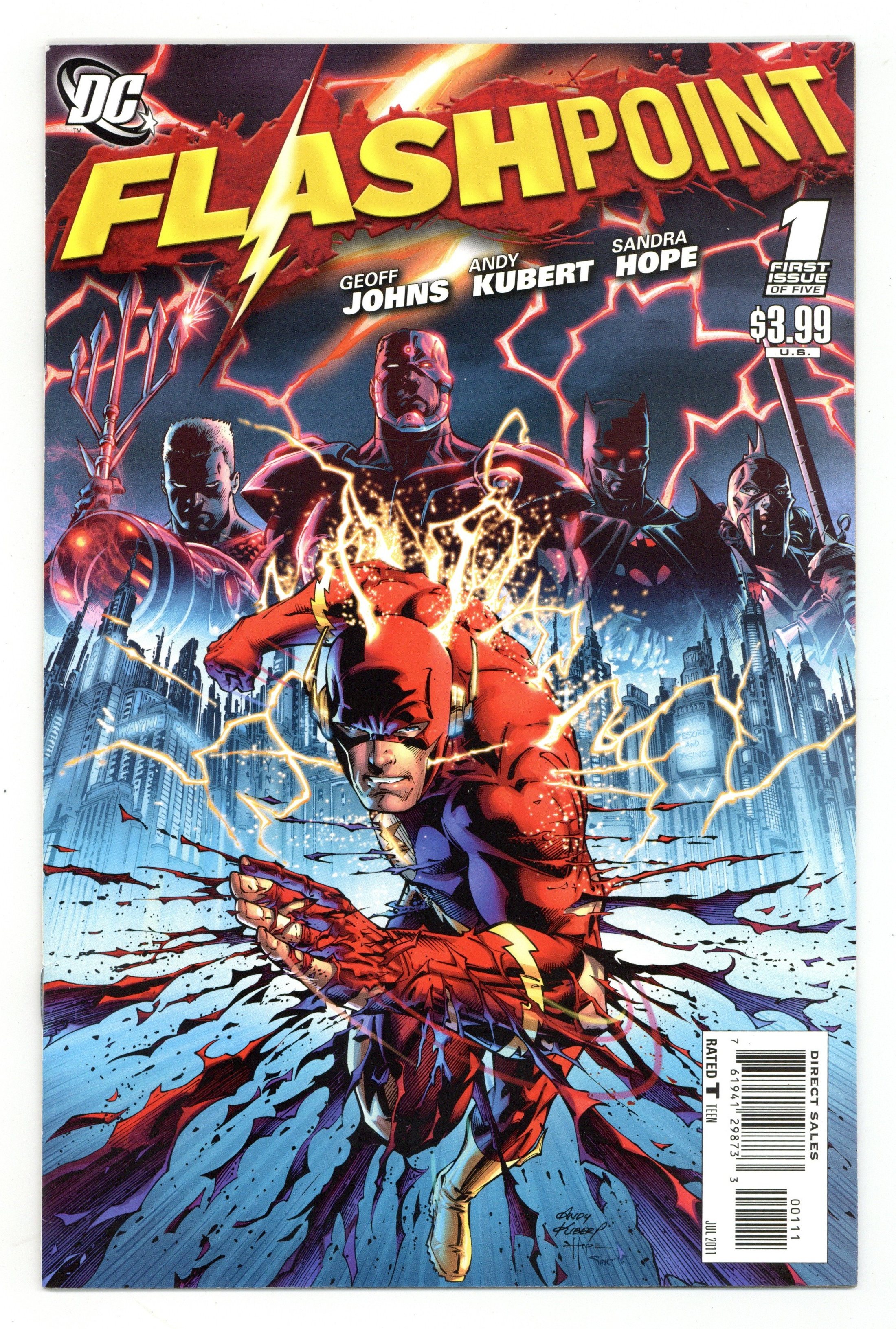 Tags: Flashpoint (part 1)$31.00Cover by ANDY KUBERT Written by GEOFF JOHNS Art by ANDY KUBERT Not a dream, not an imaginary story, not an elseworld. This is Flash Fact: When Barry Allen wakes at his desk, he discovers the world has changed. Family is alive, loved ones are strangers, and close friends are different, gone or worse. It's a world on the brink of a cataclysmic war - but where are Earth's Greatest Heroes to stop it? It's a place where America's last hope is Cyborg, who hopes to gather the forces of The Outsider, The Secret 7, S!H!A!Z!A!M!, Citizen Cold and other new and familiar-yet-altered faces! It's a world that could be running out of time, if The Flash can't find the villain who altered the time line! Welcome to FLASHPOINT! 40 pg, FC Cover price $3.99.