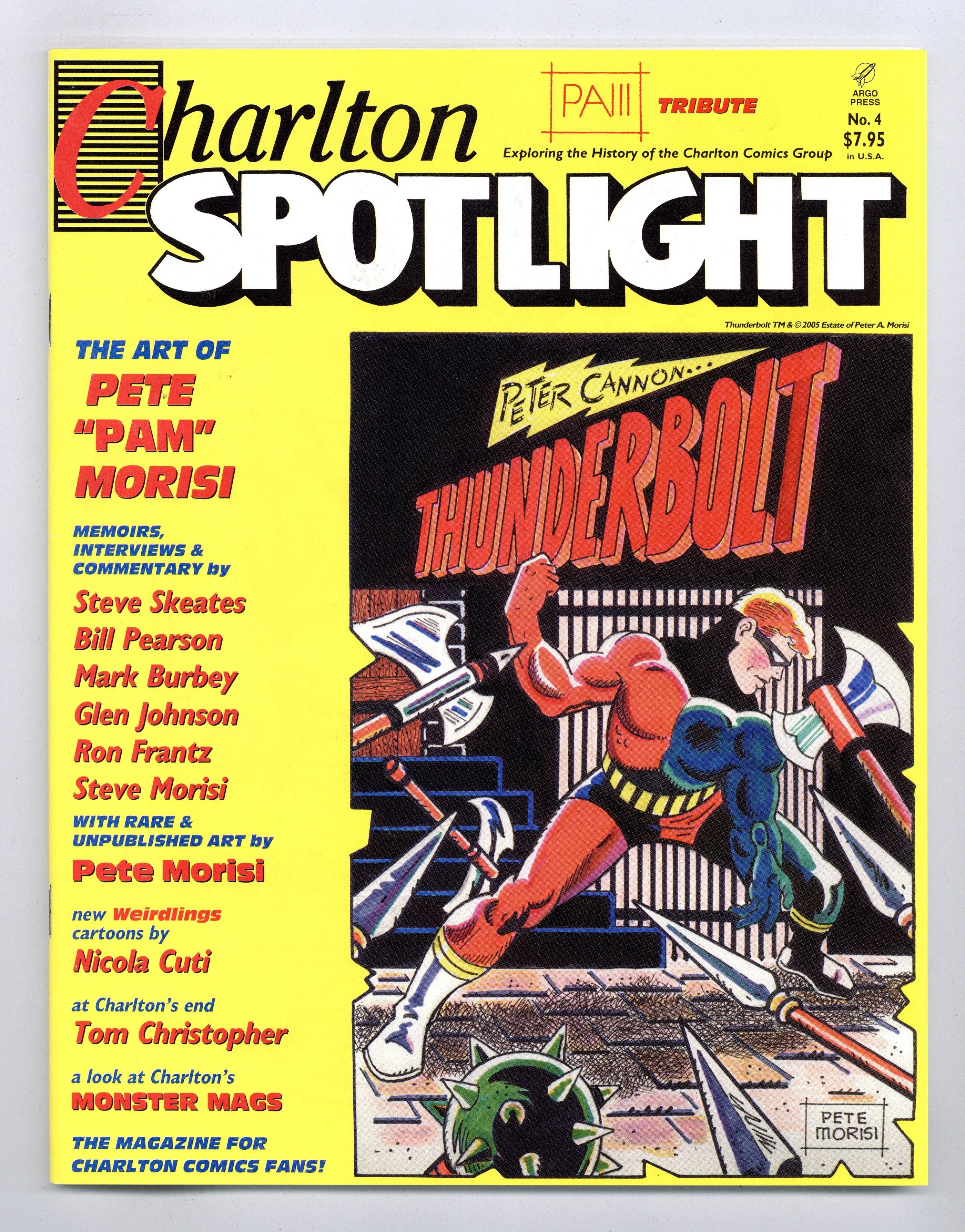$8.00Printings may vary. Exploring the legacy of 20th-century publisher Charlton Comics Group. This issue features a tribute to Pete Pam Morisi, creator of Thunderbolt, with articles by Steve Skeates and Ron Frantz, and rare and unpublished Morisi art. Also, a feature on Charltons monster magazines, and a rumination by Tom Christopher about Charltons final days. Black and white; 76 pages. Cover by Morisi. Cover price $7.95. Cover price $7.95.