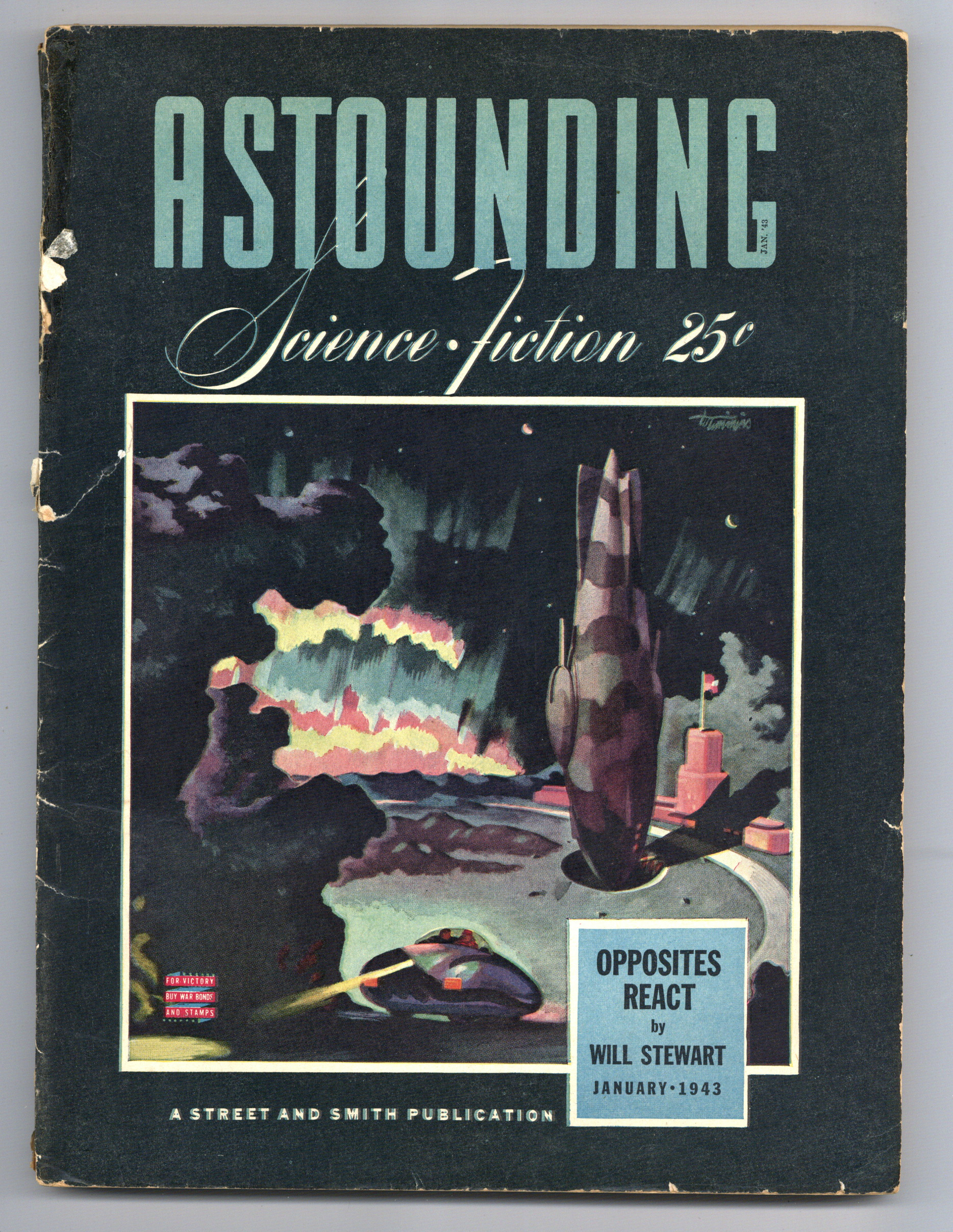 January, 1943. Volume 30, Issue 5. Cover by William Timmins. "Opposites React" Part 1 of 2 by Jack Williamson (as Will Stewart). Other science fiction stories by Ross Rocklynne, A. E. van Vogt, Henry Kuttner, Malcolm Jameson, P. Schuyler Miller, & Anthony Boucher. Interior artwork by Kolliker, Frank Kramer, Paul Orban, M. Isip, & Elton Fax. Bedsheet format, 8.5-in. x 11.5-in.; black and white; 130 newsprint pages. Cover price $0.25.