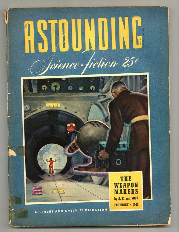 February, 1943. Volume 30, Issue 6. Cover by William Timmins. "The Weapon Makers" Part 1 of 3 by A. E. van Vogt and "Opposites React" Part 2 of 2 by Jack Williamson (as William Stewart). Other science fiction stories by J. Francis McComas (as Webb Marlowe), Henry Kuttner, C. L. Moore (as Lewis Padgett), Henry A. Norton, Malcolm Jameson, Fox B. Holden, & L. Sprague de Camp. Interior artwork by Frank Kramer & Kolliker, Bedsheet format, 8.5-in. x 11.5-in.; black and white; 130 newsprint pages. Cover price $0.25.