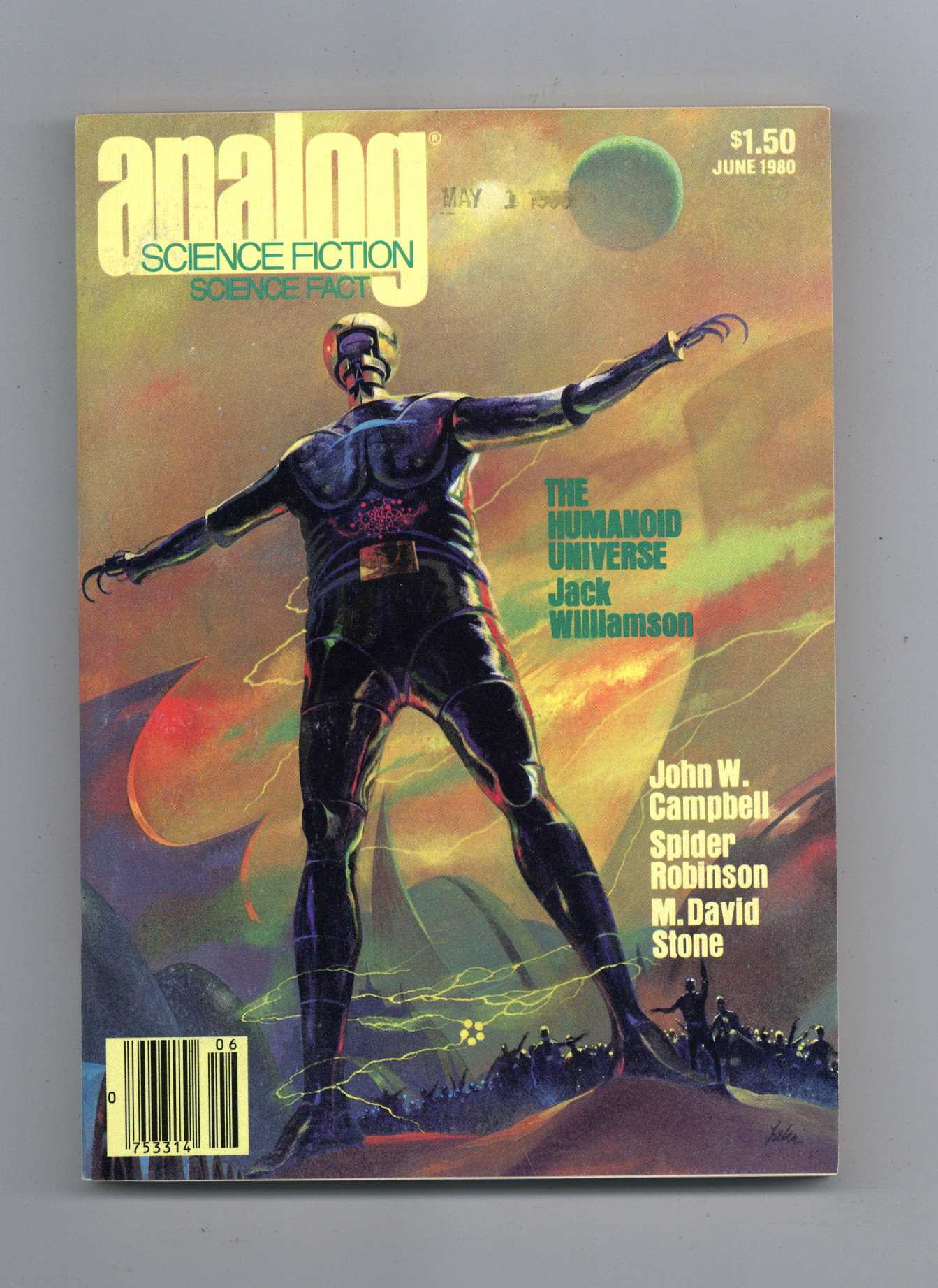 June 1980. Cover by Paul Lehr. Stories: "The Humanoid Universe" by Jack Williamson, "Have You Heard the One" by Spider Robinson, "One Time in Alexandria" by Donald Franson, "Rings of Death" by Paul J. Nahin, "Given a, Then Bee" by Dean R. Lambe, and "Downeast Encounter" by Thomas A. Easton. Science Fact article: "Beyond First Contact" by M. David Stone. Special Features: "In the Beginning..Was Campbell" by Kelly Freas, and "The Analytical Laboratory". Softcover, 5.25-in. x 7.5-in.; 178 newsprint pages, B&W. Cover price $1.50.