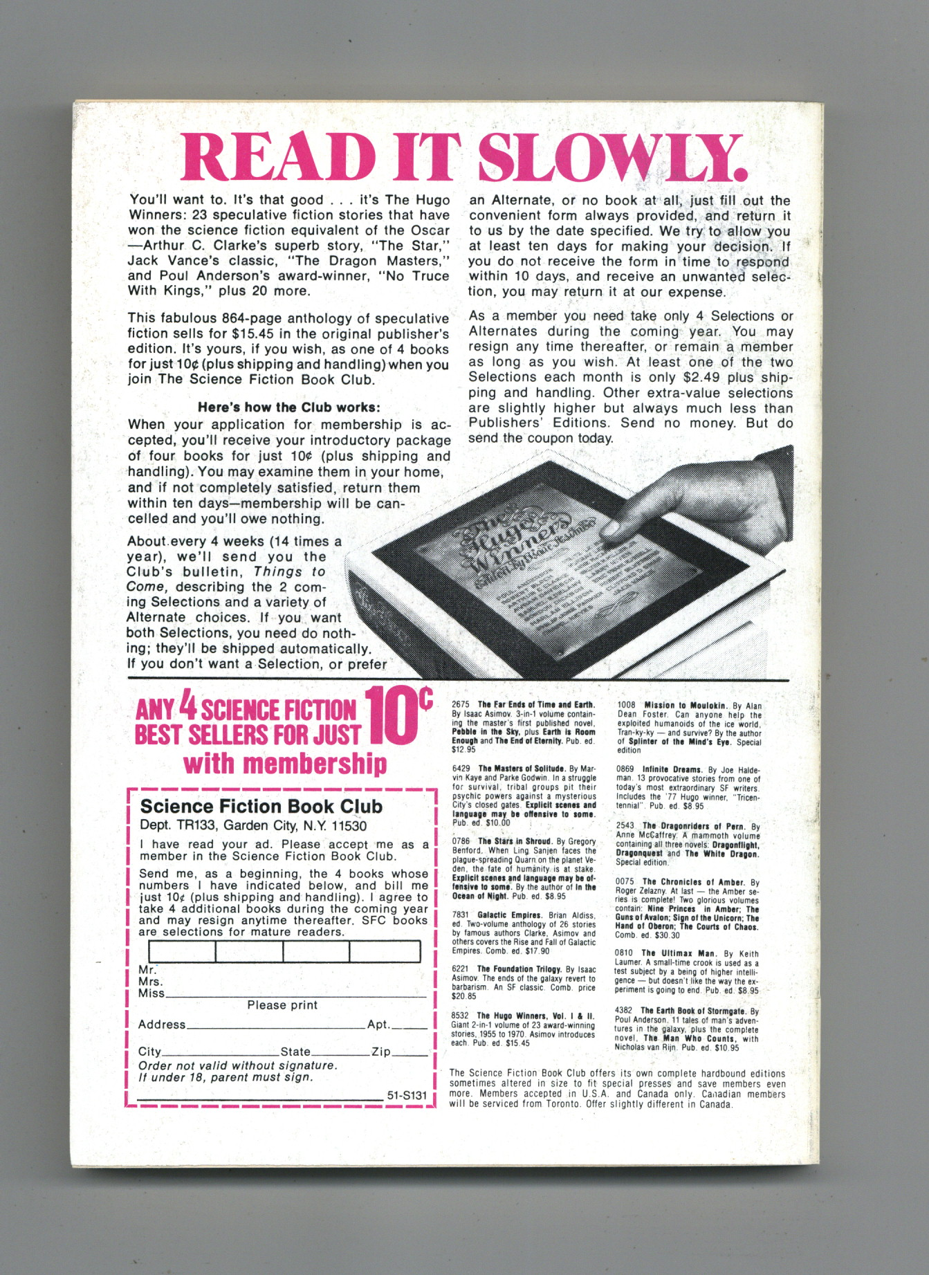 Published Apr 1979 by Dell Magazines.$6.30April 1979. Cover by John Sanchez. Stories: "Titan"(Conclusion) by John Varley, "Duty, Honor, Planet" by Michael McCollum. "Reunion" by Paul J. Nahin, "Share it with Me" by Kirill Bulychev, "Pathway" by Edward A. Byers, "Redeemer" by Gregory Benford, "The Thirteenth Utopia" by Somtow Sucharitkul, and "Mayfair" by Thomas Sullivan. Science Fact article: "Build your own A-Bomb and Wake up the Neighborhood" by George W. Harper. Softcover, 5.25-in. x 7.5-in.; 178 newsprint pages, B&W. Cover price $1.25.