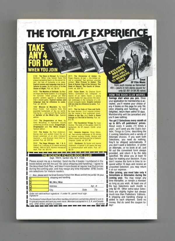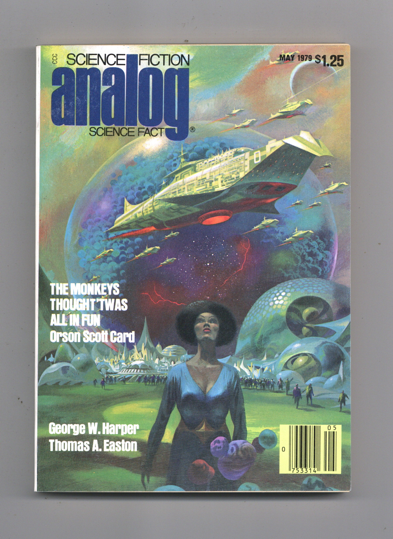 Published May 1979 by Dell Magazines.$6.30May 1979. Cover by Paul Lehr. Stories: "The Monkeys thought 'Twas all in Fun" by Orson Scott Card, "A Twice-Toed Tale" by George W. Harper, "Old Friends Across Time" by Paul J. Nahin, "Quantum Jump" by M. David Stone, and "Ghostwritten Man" by Eric Vinicoff and Marcia Martin. Science Fact articles: "Twenty Years to Space" by Thomas A. Easton, and "War and Space" by Charles Duelfer. State of the Art article: "Science Fiction and 'Literature' or the Conscience of the King" by Samuel R. Delany. Softcover, 5.25-in. x 7.5-in.; 178 newsprint pages, B&W. Cover price $1.25.