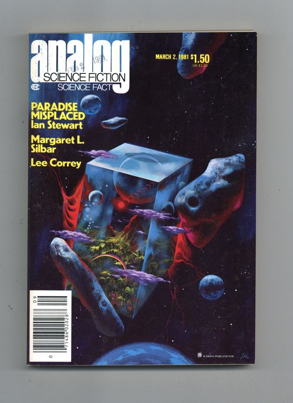 Published Mar 1981 by Dell Magazines.$4.20March 1981. Cover by Paul Lehr. Stories: "Shuttle Down"(Conclusion) by Lee Correy, "Paradise Misplaced" by Ian Stewart, "We're Working on it" by Robin Kincaid, "The Shroud" by Michael McCollum, and "Mustard Seed" by Jayge Carr. Science Fact article: "And Now-Supergravity!" by Margaret L. Silbar. Softcover, 5.25-in. x 7.5-in.; 178 newsprint pages, B&W. Cover price $1.50.