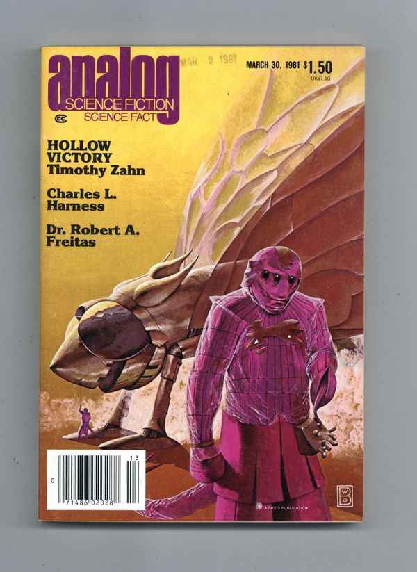 Published Mar 1981 by Dell Magazines.$4.20March 1981. Cover by Wayne Barlowe. Stories: "The Venetian Court" by Charles L. Harness, "Hollow Victory" by Timothy Zahn, "Schrodinger's Cat" by Rudy Rucker, "Incredibility Gap" by Ian Stewart, "Seek Not Prometheus" by Edward A. Byers, and "Security Blanket" by Paul J. Nahin. Science Fact article: "Xenobiology" by Dr. Robert A. Freitas. Softcover, 5.25-in. x 7.5-in.; 178 newsprint pages, B&W. Cover price $1.50.