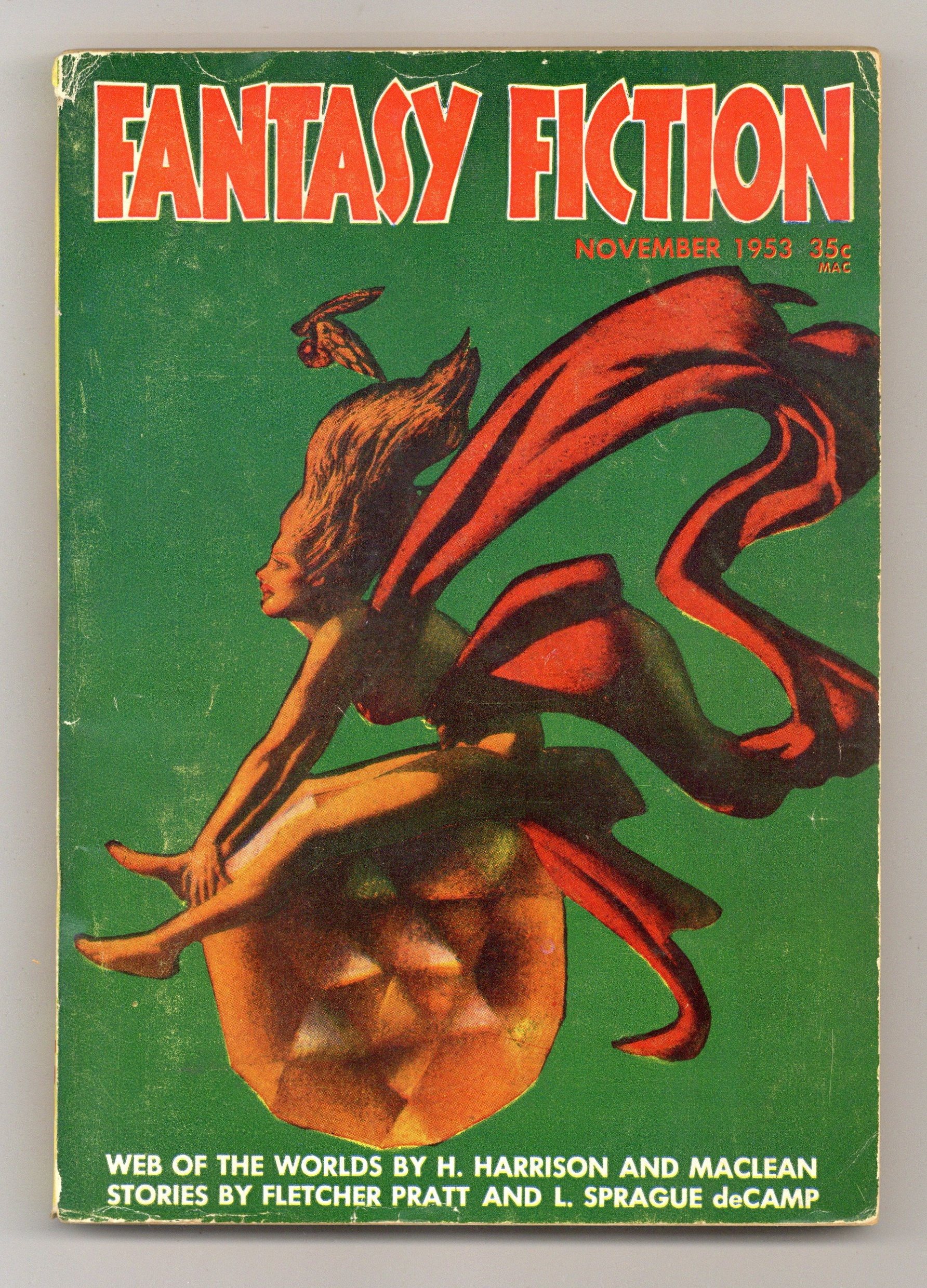 Published Nov 1953 by Future Publications, Inc..$24.00November 1953. Fantasy Stories: "Web of the Worlds" by Katherine MacLean and Harry Harrison, "Capital Expenditure" by Fletcher Pratt, "Nothing To It" by William S. Corwin, "Schizoid Creator" by Clark Ashton Smith, "Medicine Dancer" by Bill Brown, "De Demon-Natur-" by Wesley Barefoot, "The Stronger Spell" by L. Sprague De Camp, and "The Apprentice Sorcerer" by Stephen Arr. Softcover Pulp Digest, 5-in x 7 1/2-in, 160 Pages, B&W. Cover price $0.35.