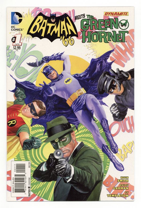 Written by Kevin Smith and Ralph Garman. Art by Ty Templeton. Cover by Alex Ross. In 1967, television history was made when two masked crime fighters met in a historic crossover. Now, superstar filmmaker Kevin Smith and actor/comedian Ralph Garman join forces with artist Ty Templeton (BATMAN '66) to bring these two iconic characters and their famous partners together again. Set in the continuity of that earlier team-up, Batman, The Green Hornet, Robin and Kato must go up against a very different General (formerly Colonel) Gumm. What crime could be so deadly as to force these rivals to put aside their differences and join forces again? And what surprise does Gumm have up his sticky sleeve? Co-published with Dynamite Entertainment. 28 pages, full color. Cover price $2.99.