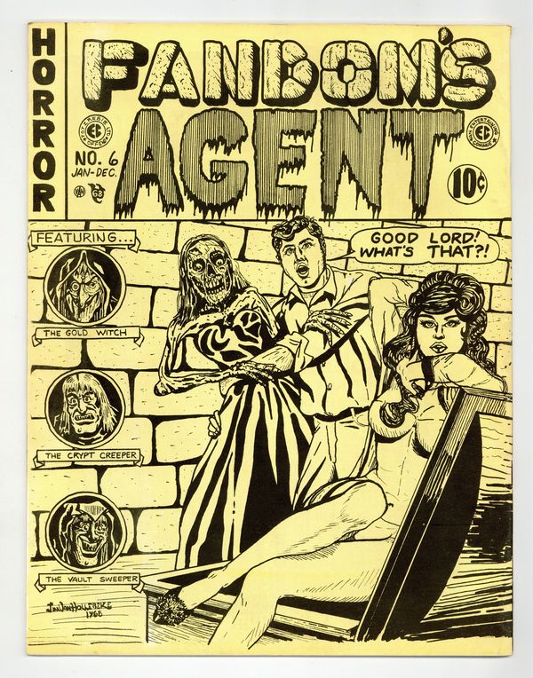 Published 1968 by No publisher listed/fanzine.$8.00Cover by Buddy Saunders, owner and founder of MyComicShop. Published by Chuck Wooley in 1968. This is a double issue. Larry Herndon's "Fandom's Library" continues. Other features include a list of movie serials, a panelology quiz, a short interview with Syd Shores, fanzine reviews, "The Evolution Of EC Horror," and an article on comic strip collecting. A 14 page history of the comics, told exclusively through key comic covers, is an issue highlight (extremely good reproduction). Ronn Foss and Jim Jones are among the interior artists. There are many pages of ads, with noteworthy offerings including All Star 8 for $35., Batman 1 for $125., Jungle Girl 1 (Nyoka) for $4., Mad 1 for $15., Planet 4 for $22. and Shock Suspenstories 6 for $8. Buddy Saunders has a full page ad, which includes Fantastic Four 48 for 50c, and 52 for 30c. Silver Surfer 1 was $1. A great many other fascinating ads are also present. The issue concludes with a back cover parody of an EC horror comic, by Jim Van Hollebeke. 8 1/2-in. x 11-in. 48 pages. B&W. Cover price $1. Cover price $1.00.
