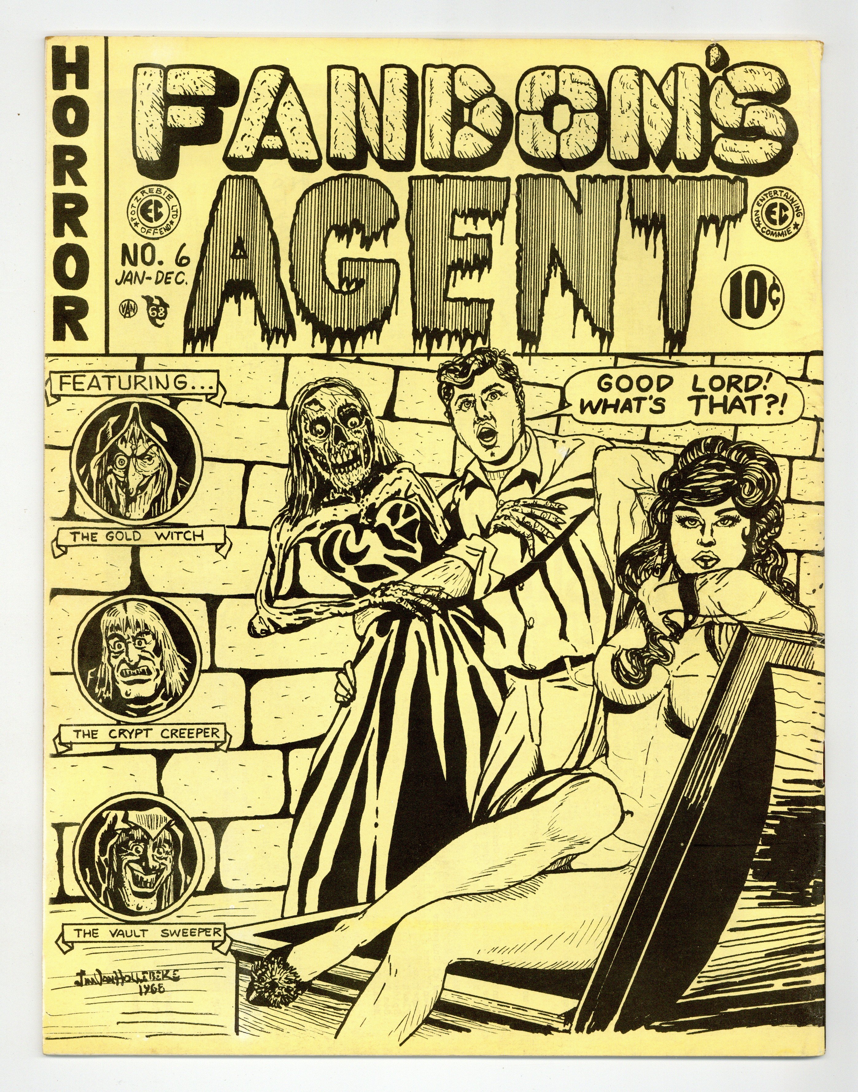Cover by Buddy Saunders, owner and founder of MyComicShop. Published by Chuck Wooley in 1968. This is a double issue. Larry Herndon's "Fandom's Library" continues. Other features include a list of movie serials, a panelology quiz, a short interview with Syd Shores, fanzine reviews, "The Evolution Of EC Horror," and an article on comic strip collecting. A 14 page history of the comics, told exclusively through key comic covers, is an issue highlight (extremely good reproduction). Ronn Foss and Jim Jones are among the interior artists. There are many pages of ads, with noteworthy offerings including All Star 8 for $35., Batman 1 for $125., Jungle Girl 1 (Nyoka) for $4., Mad 1 for $15., Planet 4 for $22. and Shock Suspenstories 6 for $8. Buddy Saunders has a full page ad, which includes Fantastic Four 48 for 50c, and 52 for 30c. Silver Surfer 1 was $1. A great many other fascinating ads are also present. The issue concludes with a back cover parody of an EC horror comic, by Jim Van Hollebeke. 8 1/2-in. x 11-in. 48 pages. B&W. Cover price $1. Cover price $1.00.