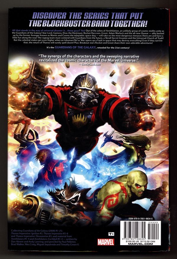 1st printing. Collects Guardians of the Galaxy (2008-2010 2nd Series) #1-25, Thanos Imperative: Ignition (2010), #1-6 and Thanos Imperative: Devastation (2011 Marvel), and material from Annihilators (2011 Marvel) #1-4 and Annihilators: Earthfall (2011 Marvel) #1-4. Written by Dan Abnett and Andy Lanning. Art by Paul Pelletier, Brad Walker, Carlos Magno, Wes Craig, Miguel Sepulveda, Rick Magyar, Victor Olazaba, Jack Purcell, John Livesay, Scott Hanna and Various. Cover by Alex Garner. All that stands in the way of universal disaster is an unlikely band of cosmic misfits: the Guardians of the Galaxy, retooled for the 21st century! Star-Lord, Gamora, Drax the Destroyer, Rocket Raccoon, Groot, Adam Warlock, Mantis and the all-new Quasar -- together with Cosmo the telepathic space dog -- take on the universe's most dangerous menaces and have a little fun along the way! The ragtag team must contend with Guardians from the future, a Skrull Secret Invasion and the Church of Universal Truth before the celestial stakes get even higher when an Inhuman/Shi'ar War opens up a Fault in space that may destroy everything! And the return of Thanos could spell doom for the Guardians! Plus: The solo adventures of breakout stars Rocket and Groot! Hardcover, 7 1/2-in. x 11-in., 936 pages, full color. Cover price $100.00.