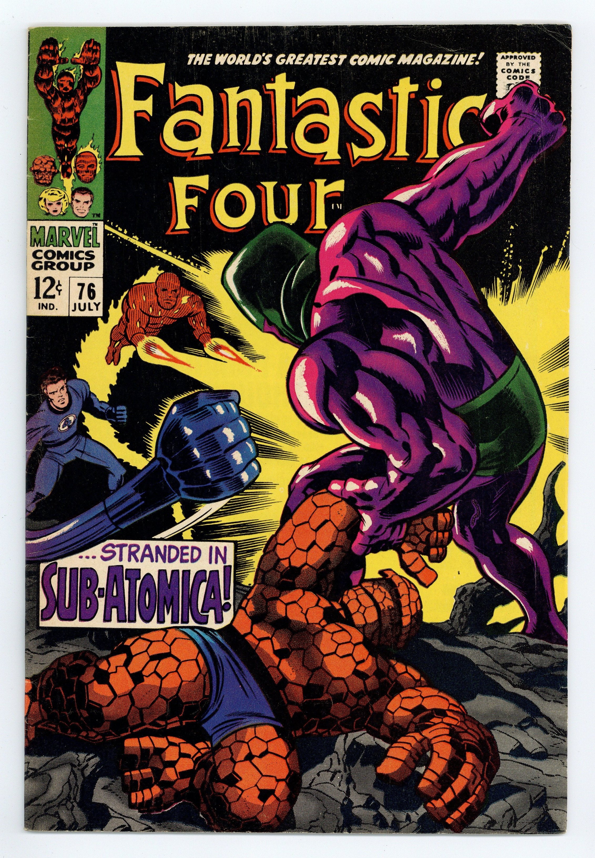 Cover pencils by Jack Kirby, inks by Joe Sinnott. The Silver Surfer, Galactus, and Crystal (of the Inhumans) guest star in Stranded in Sub-Atomica!, script by Stan Lee and Jack Kirby (co-plot), pencils by Jack Kirby, inks by Joe Sinnott; Reed, Ben, and Johnny journey to Subatomica to bring the Silver Surfer back to earth. Reprinted in Marvel's Greatest Comics # 58. 36 pgs. $0.12. Cover price $0.12.