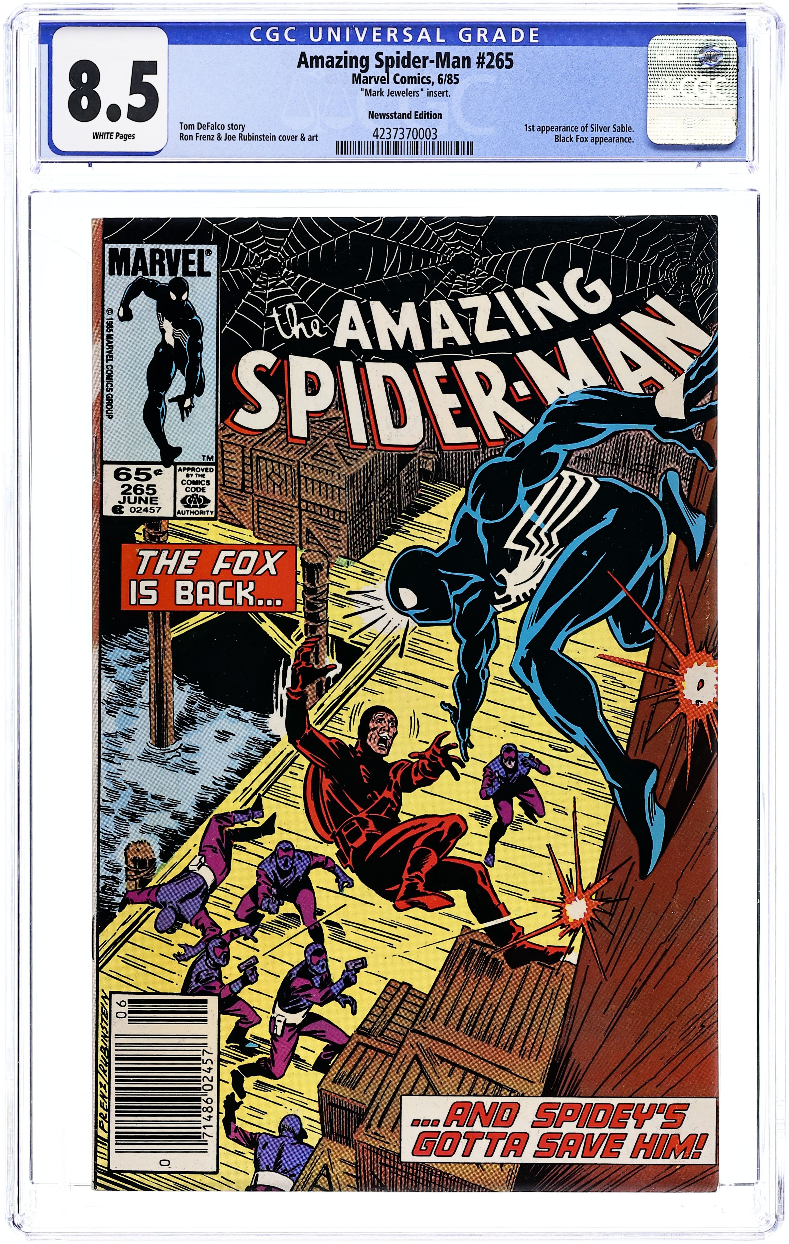 Mark Jeweler Advertisement Insert Variant. First printing of "After the Fox!" First appearance of Silver Sable. Script by Tom DeFalco. Pencils by Ron Frenz. Inks by Joe Rubinstein. Cover by Ron Frenz and Joe Rubinstein. The Black Fox is on the run! But it's not the Spectacular Spider-Man who's chasing him! It's Silver Sable! An adventurer for hire from the European country of Symkaria! Silver Sable and her Wild Pack pursue the fox through the streets of Manhattan and then later corner him on the waterfront! However, the aging international jewel thief has a wall-crawling guardian angel! Down on the docks, the sparks fly as the web-slinger gives Silver Sable a lesson in diplomacy...superhero-style! Second appearance of the Black Fox. Cameo appearances by Aunt May, Mary Jane Watson, Harry Osborn, Liz Osborn, and Normie Osborn. (Notes: Silver Sable appears next in Amazing Spider-Man 279. The Black Fox returns in Web of Spider-Man 14. There is a second printing of this issue published in 1992. The second printing features a gray cover and a yellow dog ear touting the first appearance of Silver Sable. This story was also reprinted in Marvel Tales 277.) Cover price $0.65.