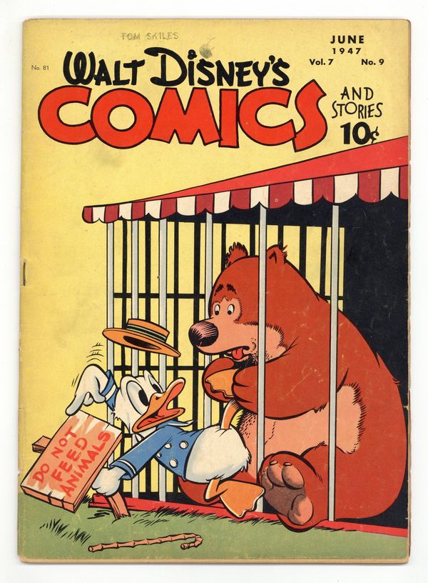 Stories and art by Carl Barks, Floyd Gottfredson, Merrill De Maris, Bob Karp, Hubie Karp, Ralph Heimdahl, Paul Murry, George Waiss, Bill Wright, Sylvia Holland, and Al Taliaferro. Sometimes listed as Vol. 7 #9. The long-running vehicle for Disney character comics featured work by Carl Barks, Floyd Gottfredson, and Pogo's Walt Kelly. In a classic story from the Mickey Mouse comic strip, Mickey matches wits with a mesmerist who uses his act for jewel theft. In a story by Barks, Donald mistakes his nephews' fake treasure map for the real thing. Li'l Bad Wolf explores a haunted mine and finds a bear. Donald Duck; Bucky Bug; Li'l Bad Wolf; Mickey Mouse; Crazy with the Heat; The May Baskets; Donald's Dilemma; Mickey Mouse: The Jewel Robbery. 48 pages, Full Color. Cover price $0.10.