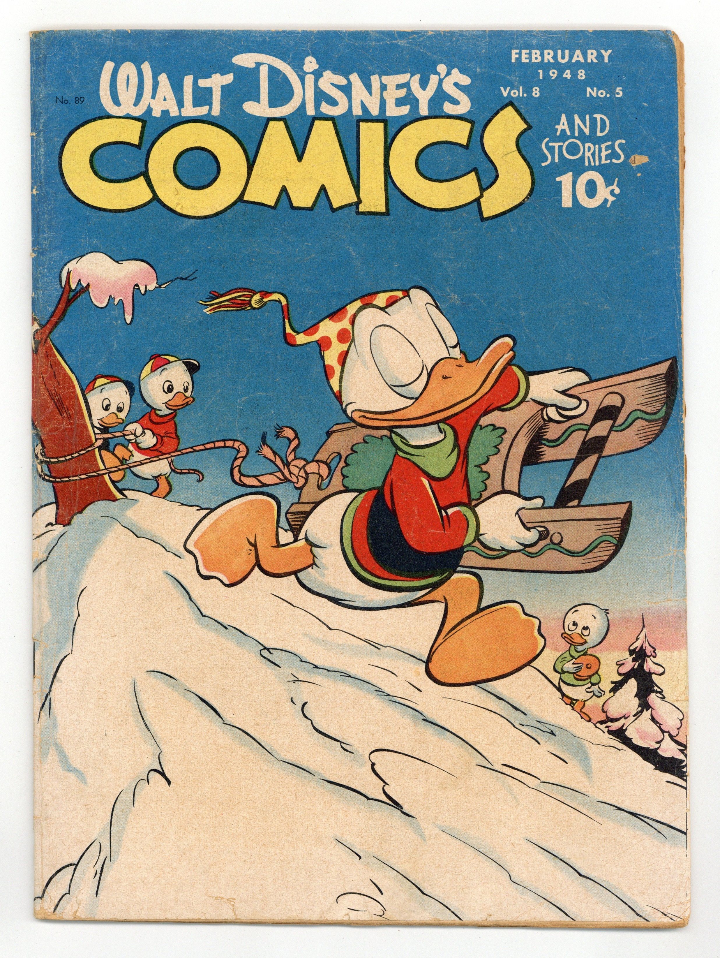 Cover by Walt Kelly. Stories and art by Carl Barks, Floyd Gottfredson, Merrill De Maris, Dick Moores, Bob Karp, Dick Shaw, Ralph Heimdahl, Gil Turner, Don Gunn, George Waiss, Bill Wright, Sylvia Holland, and Al Taliaferro. Sometimes listed as Vol. 8 #5. The long-running vehicle for Disney character comics featured work by Carl Barks, Floyd Gottfredson, and Pogo's Walt Kelly. In a classic story from the Mickey Mouse comic strip, Goofy acquires a pet lion named Agnes. In a story by Barks, Donald's nephews try to keep him from falling asleep while he's working as a night watchman. Bucky Bug attends an auction of items found after a storm. An adaptation of the Disney cartoon Chip an' Dale is the chipmunks' first solo story in Walt Disney Comics and Stories. Donald Duck; Bucky Bug; Li'l Bad Wolf; Mickey Mouse; A Day in the Snow; Chip 'n' Dale; Mickey Mouse: Goofy and Agnes. 48 pages, Full Color. Cover price $0.10.