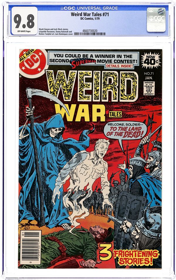 Cover art by Luis Dominguez. All the Wars at Once!, script by Wyatt Gwyon, art by Romeo Tanghal; set in Germany during World War II and also in a version of Hell. 21 Days in Hell, script by Jack Oleck, pencils by Danny Bulanadi, inks by Bob Smith; set on 6 December 1941 in Seattle, Washington and at Pearl Harbor during World War II, as well as at Pearl Harbor in December 1946. False Prophet, script by Jack Oleck, art by Leopoldo Duranona; set during the time of the Spanish conquistadores. Daily Planet Volume 78 Issue 41, script by Bob Rozakis, art by Mike Grell and Fred Hembeck. 32 pgs. $0.40. Cover price $0.40.